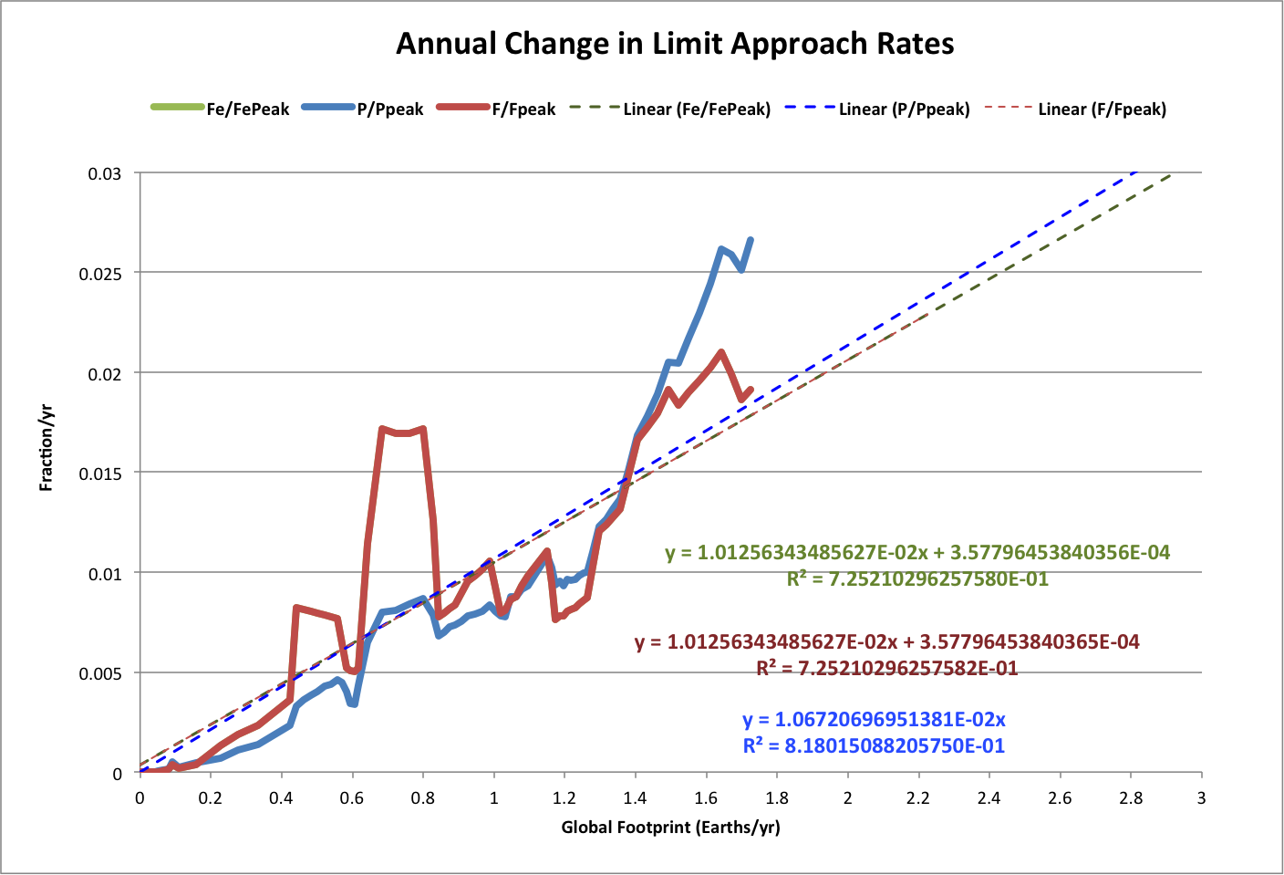 where F is per-capita ecological footprint in Earths/person/year. This type of relationship can be summarized as