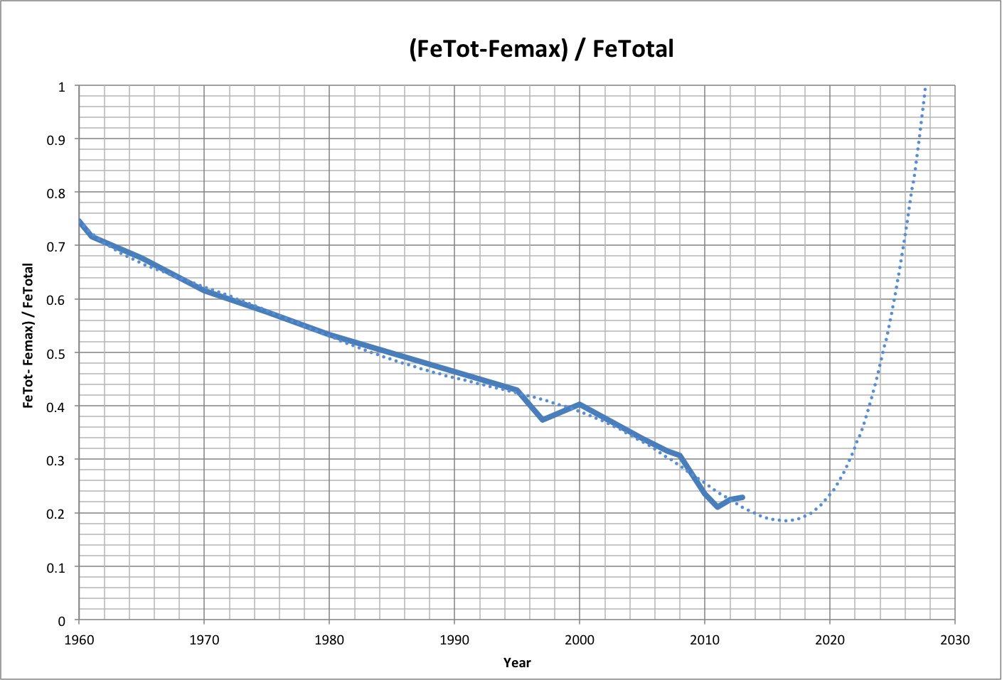 | The following graph shows a sixth-order curve fit to the remaining fraction of FeTotal for data from 1960-2013 (dotted line). Note that the minimum fraction is 0.18, as expected where Femax reaches its maximum, and this occurs in 2016. |