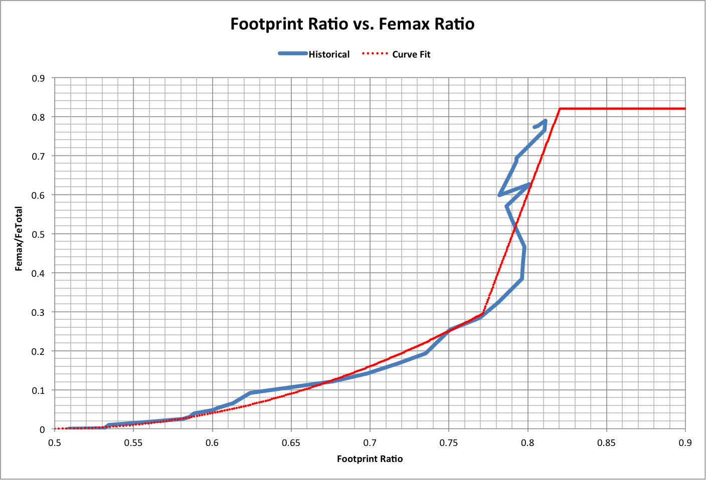 At Fratio = 0.82, the remaining total footprint FeTotal - Femax = 0.5. The following graph shows this value as calculated by the curve fit (Ideal) and using historical numbers: |