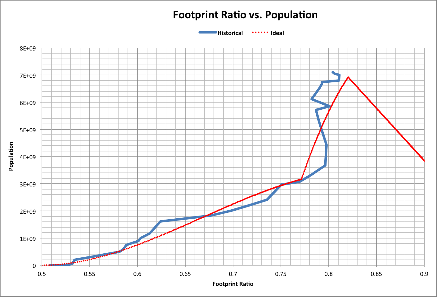 | The following graph shows population as a function of the footprint ratio, including values calculated from the Ideal: |