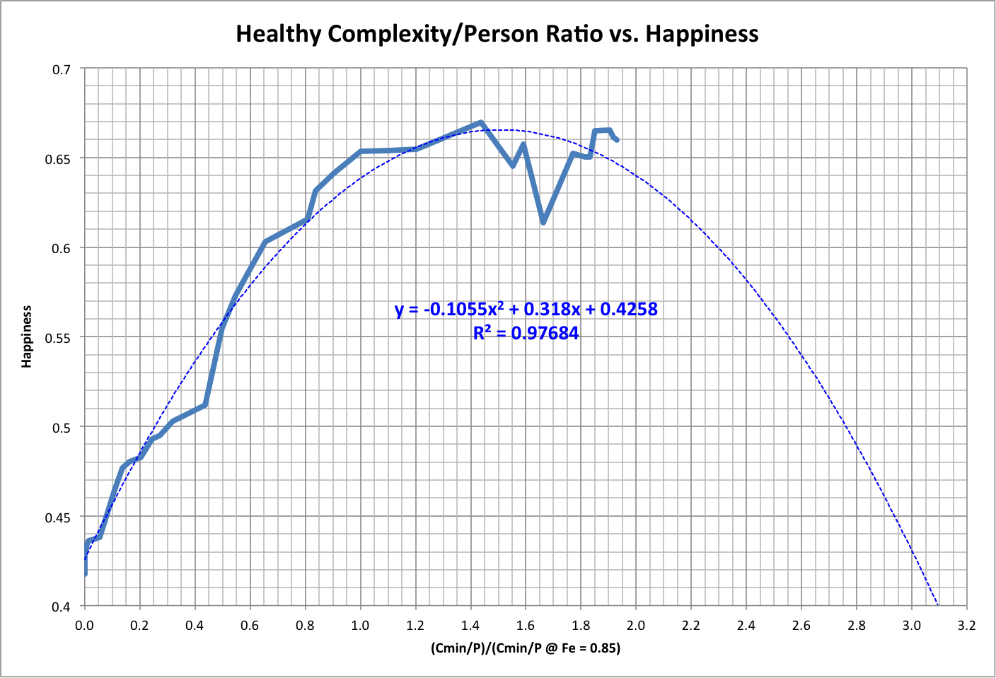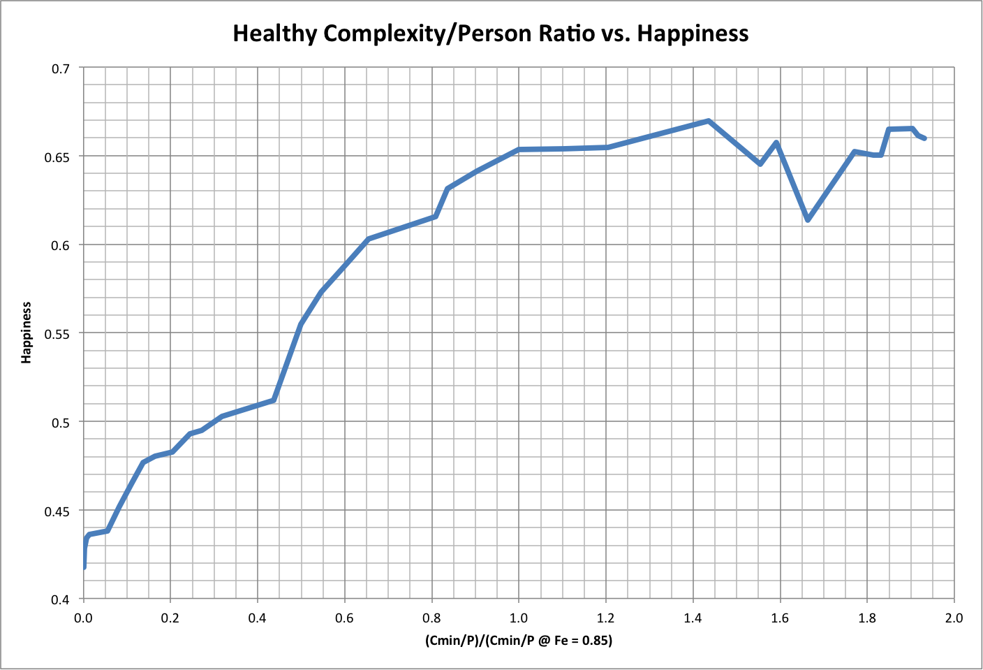 To identify a possible relationship between complexity and happiness, complexity per person is used (Cmin/P) because it corresponds to an individual person's perception of complexity. For Cmin = 3 * P 2 + 2 * P, Cmin/P = 3 * P + 2. This simplifies to 3 * P for large populations (city-size and greater). To simplify comparison, the complexity per person is presented as a ratio of its value, in a given year, to its value when the total ecological footprint (Fe) was at its maximum healthy value of 0.85 Earth/year in 1970, which still allowed enough resources for other species to survive and continue maintaining a habitable world. The following graph uses data from the analysis in version 4 of the Population-Consumption Model (PCM v4) over the years 10000 BC to 2013 AD: |