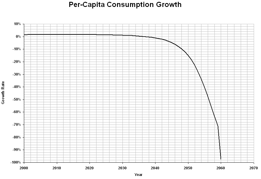 My combined population model (and the laws of consumption it embodies) predicts that world per-capita consumption will stop accelerating this year and its growth rate will begin decreasing. If profit growth follows suit, which it should, then investment will decline; credit, which is a bank’s version of investment, will also drop. When per-capita consumption (and overall consumption) stops growing entirely, the world population will reach its maximum size; after that, resource depletion will reduce consumption, more people will die than are being born, and the population will crash.