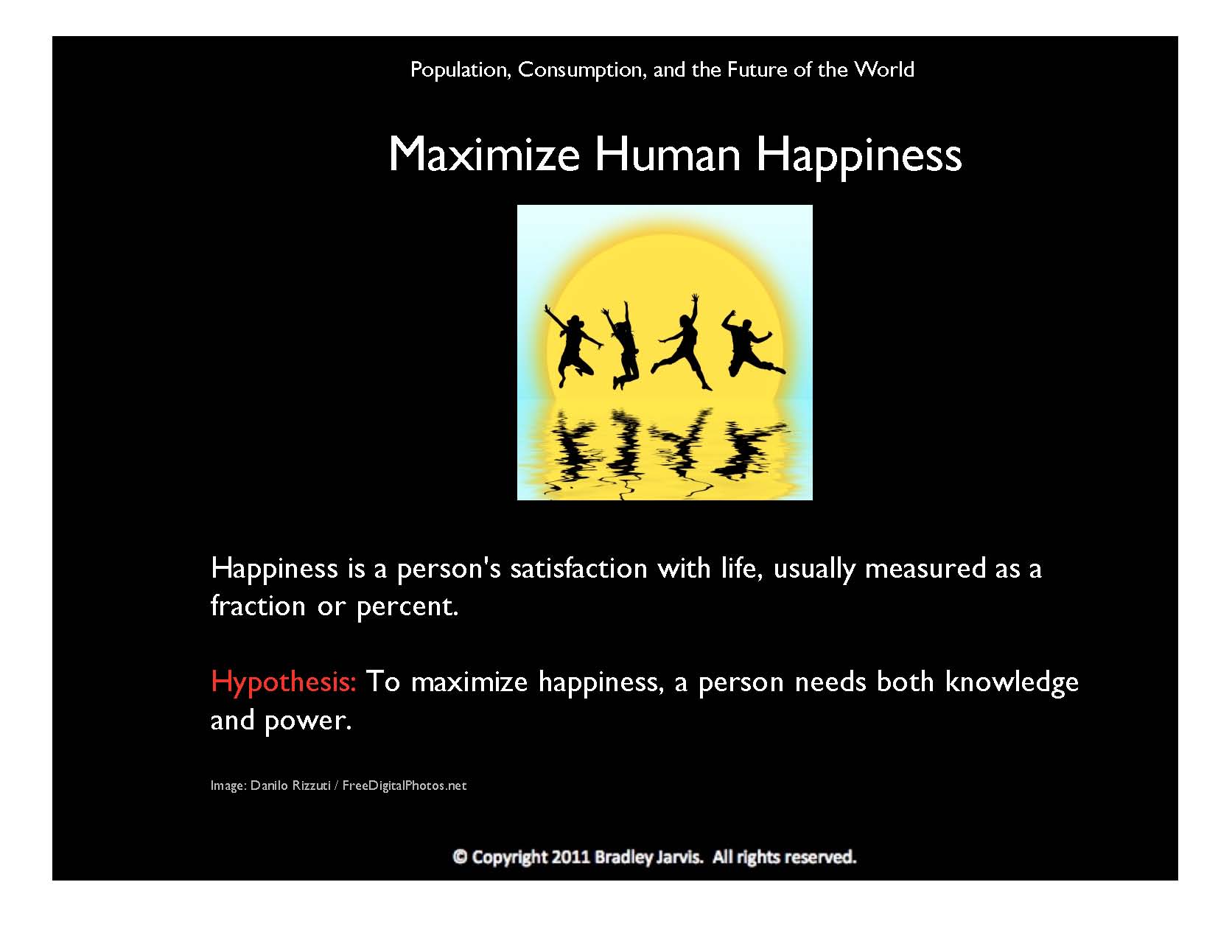 Another, more direct measure of "quality of life" is happiness. While it is subjective, happiness is also quantifiable, usually by asking specific questions about how satisfied people are. To me, it's obvious that for each of us to influence how how happy we are, it's important to know what will make us happy, and figure out how to get it. Then we need the ability to get it, what I call "power."