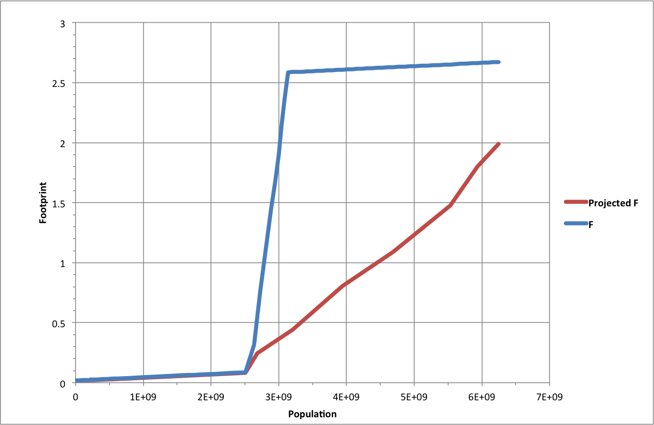 Here we see the result of using lifespan to estimate the historical footprint as a function of population. Interestingly, the slope of the curve up to the 1950 values (just before the sharp increase at the bottom) is the same as the slope after the increase (beginning in 1961). I can only guess what was responsible for the change in the 1950s; improved agriculture, use of antibiotics, and the birth of the consumer culture are my current favorites. Of course, it could just be an artifact of the data. UPDATE: If footprint is calculated from estimates of life expectancy after 1950 (see orange line below), it increases much more gradually. There is still, however, a marked change beginning in 1950 that bears further investigation. Taking into account that the life expectancy of the United States in the 1960s was very close to what it is today, one explanation for the difference may be that "developed" countries were responsible for the vast majority of ecological impact (which seems a truism), making the average much less representative of the whole.