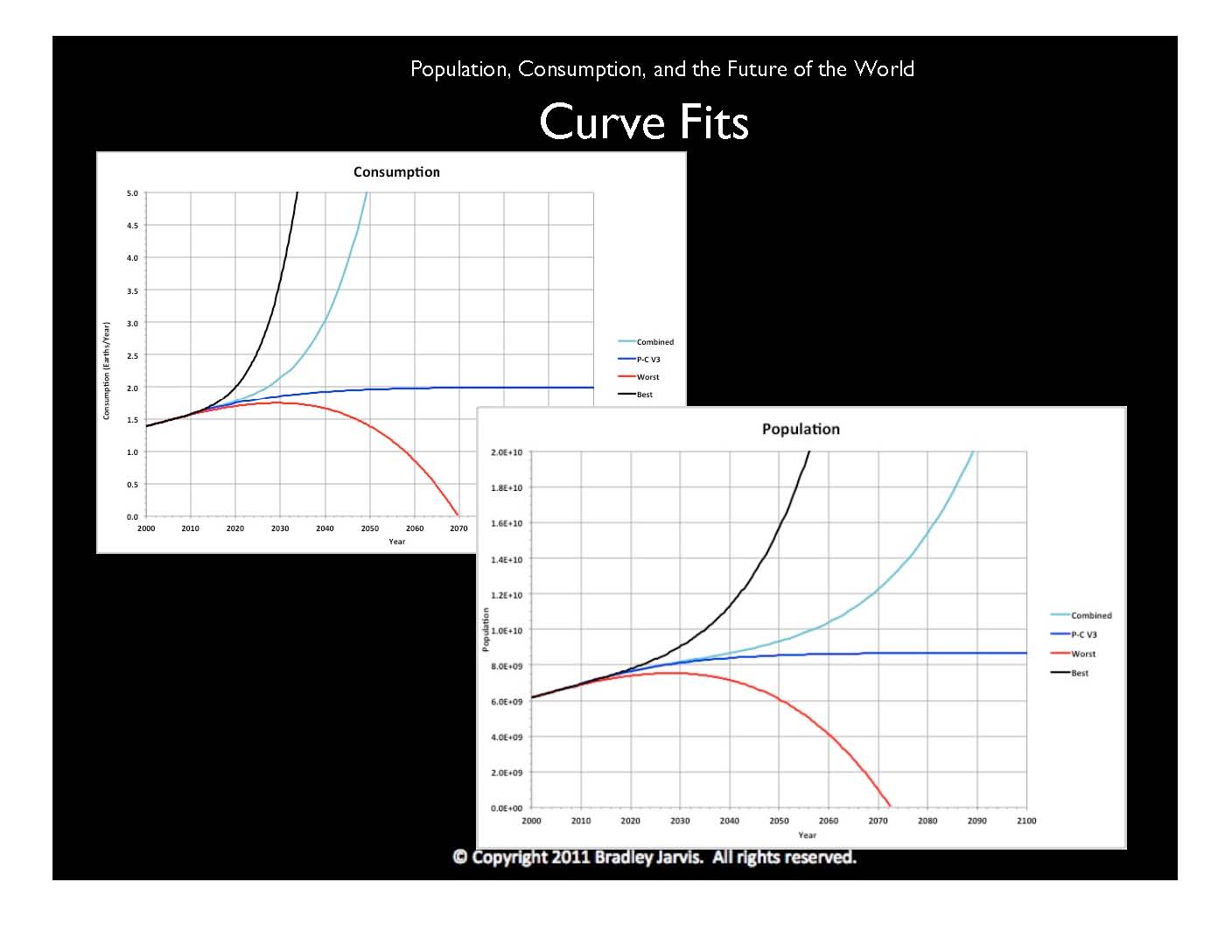 Throughout my research, I've used a mathematical technique called "curve-fitting" to derive algebraic expressions that best describe sets of data. In each of these graphs, I've used three separate curve fits to historical data, representing different outcomes in population, and then come up with a formula that's representative of all three. The worst of these scenarios is, appropriately, in red. Population and consumption reach a peak by 2030 and then drop to zero. The best scenario, in black, involves massive growth and would almost certainly require us to go into space. Both the worst and best scenarios are based on population and consumption plotted over time, but using different "polynomial curve fits" for the data. There is, however, an apparent relationship between the population growth rate and consumption. Population growth rate is the percentage change in population from one year to the next. I've done a curve fit to the growth rate as a function of consumption, and it nicely matches what ecologists call a "logistic curve," as shown in dark blue, approaching a value and then staying there. In this case, world population is approaching 8.7 billion people and consumption is approaching 2 Earths. My father was an industrial engineer. When I was a kid, he introduced me to an estimation method called PERT that was invented by Admiral Hyman Rickover to come up with realistic project schedules in the Navy. I've used it successfully as an engineer and in my research. It is basically an approximation to the familiar statistical bell curve, using three numbers to estimate the mean, or middle, of the curve, which is the expected value of whatever you're measuring. Two of the numbers are extreme guesses, typically the lowest and highest, and the third is the one that most people have guessed (called the "mode"). The expected value is equal to four times the mode, plus the low and the high values, all divided by six. I've applied the PERT formula to my curve fits, using the worst and best case scenarios as the extremes. The logistic curve is the mode, since it has a common form. The result is the Combined curves, shown in teal. Recently the U.N. released its own projections of population and consumption for 2050, which match very well with the values from my combined curves. This suggests that they may be using similar methods.