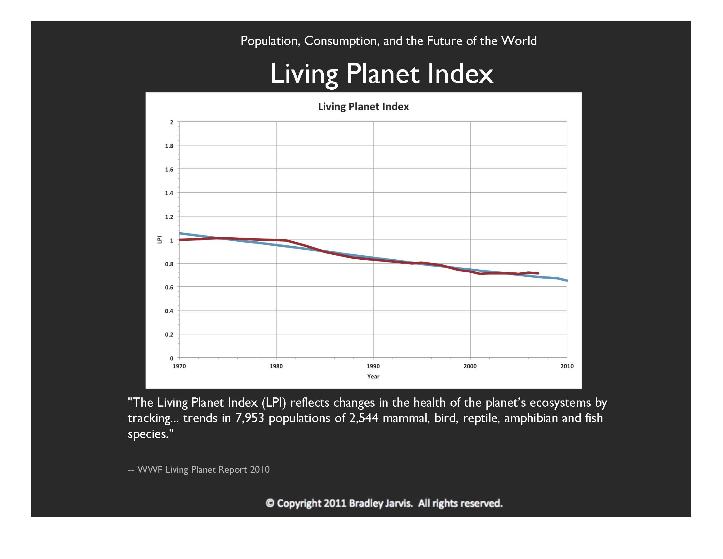We can get an idea of changes in the size of a typical population of another species by looking at the Living Planet Index. Here is a plot of the data (in red), along with my own projection of it (in blue).