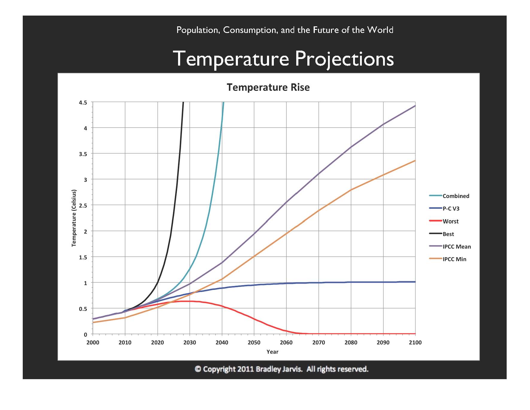 Here is the temperature rise that is associated with the consumption curve fits I discussed earlier, based on how the mean IPCC projection varies with past consumption. The minimum and mean IPCC projections are shown for comparison. Clearly, the worst cases for the climate, and our planet, are the projections with the most growth in consumption. Recall that the black and teal lines were most likely to require settlement of space; this would become imperative if the world became uninhabitable as a result.