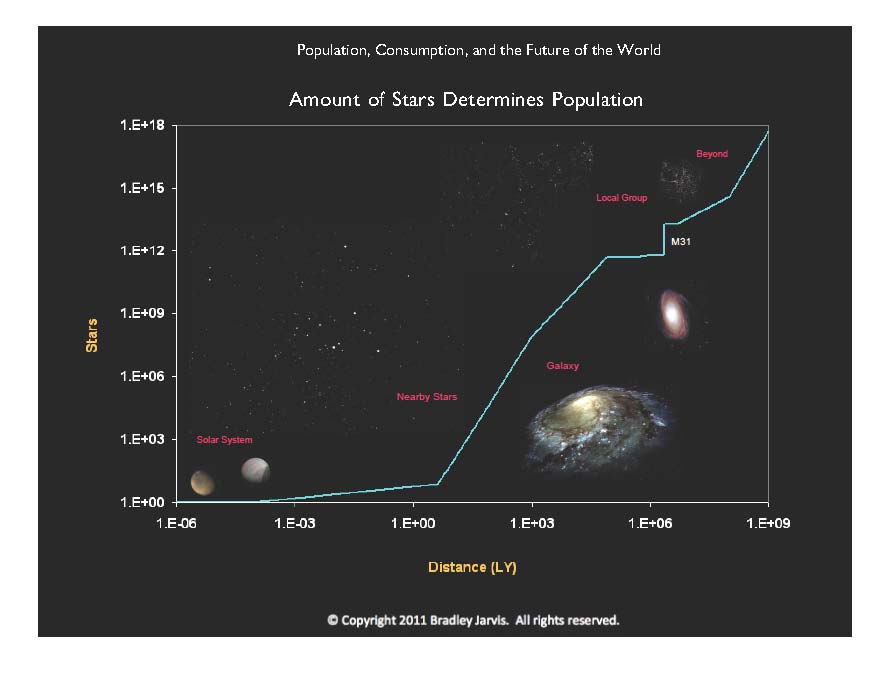 My study of population and the settlement of space showed that the amount of people we could have in the Universe is directly dependent on the number of stars there are. Basically, stars represent resources: the more places we can live, the more of us can live. This graph is a snapshot (from my Settling Space presentation) of the amount and distances of stars at present. Distance is important, because it determines how soon we can reach the fraction of stars that might have habitable planets (or asteroids we can make habitable). How soon we can reach those stars directly impacts the speed that our population can grow. Increasing speed of growth, or more specifically, exponential growth, is a stated goal of our culture, and arguably most of the world's people. My modeling of space settlement showed that ultimately, even with the most advanced technologies imaginable (that don't violate the laws of physics), the rate of population growth, as a fraction of its value, must inevitably decrease. This is largely due to the fact that there is a physical limit to how fast we can reach other stars: the speed of light, which will probably always be impossible to reach.