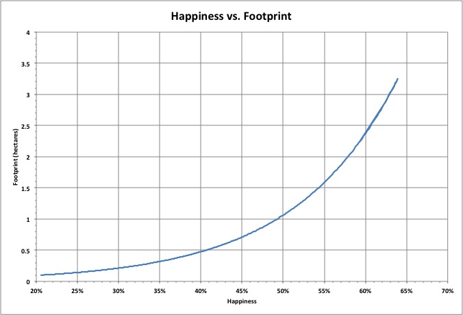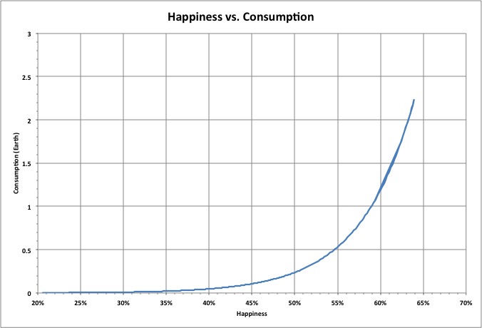 As happiness increases, the (per-capita) ecological footprint increases exponentially, which is proportional to the mass of resources consumed per year. Because population is proportional to per-capita consumption, total consumption increases rapidly with happiness.