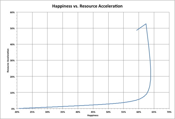 The rate of change of the resource rate (the resource acceleration) was approximately proportional to happiness until happiness had doubled its minimum value (1in 1875, at 41.2%).