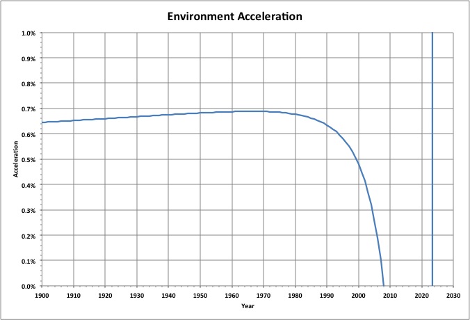 This graph shows how fast the slope of the average environment changes (its acceleration). The acceleration reached a maximum in 1965, and dropped below zero (started decelerating) in 2007.
