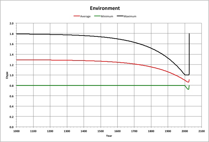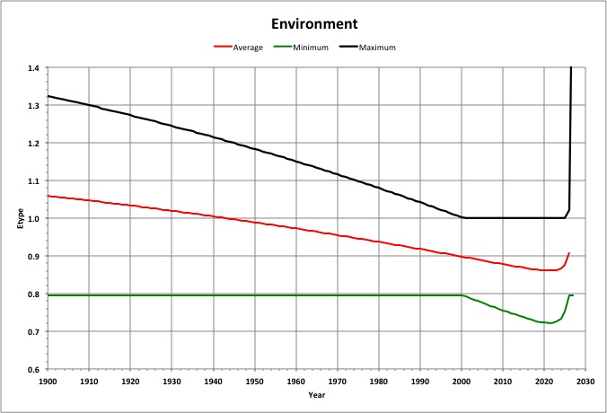Close up, we see that the average environment came under human control (fell below 1.0) in 1943, and will bottom out in 2022, just after the projected population peak. The environment's maximum value stopped decreasing in 2001, when some people couldn't get any happier. Afterwards, the environment's minimum value decreased, widening the range of environments and increasing the happiness of more people.