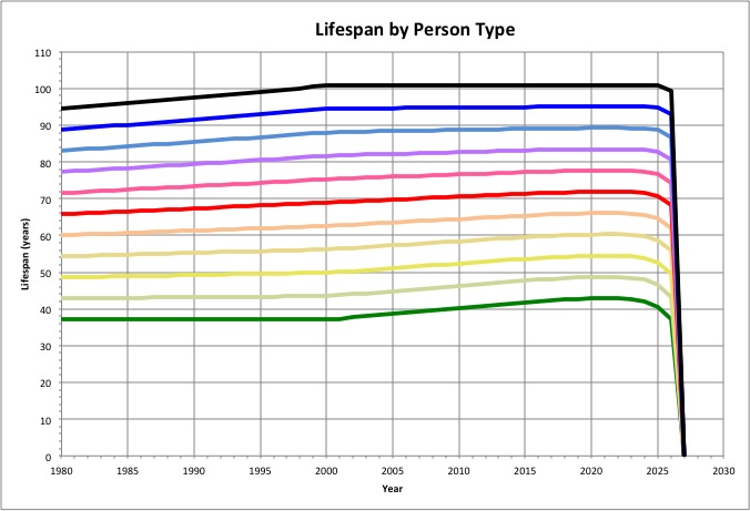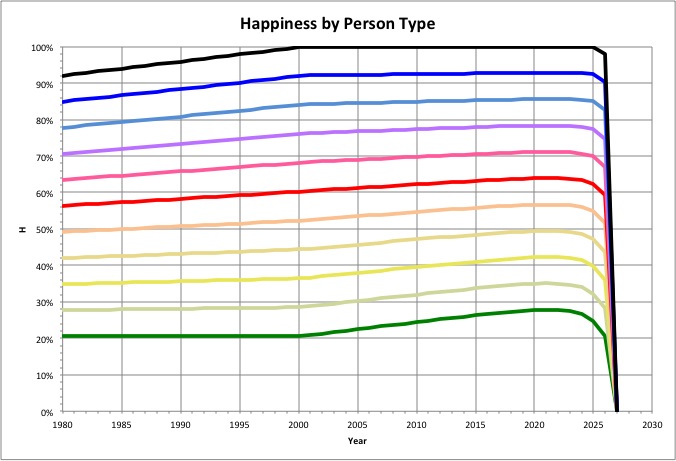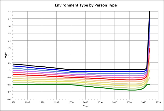 Where people can be categorized by "person types" using a variable Ptype that varies from 0 to 1 (see Environment History), we can see how several of their characteristics have changed over time, and are likely to change in the future. |
