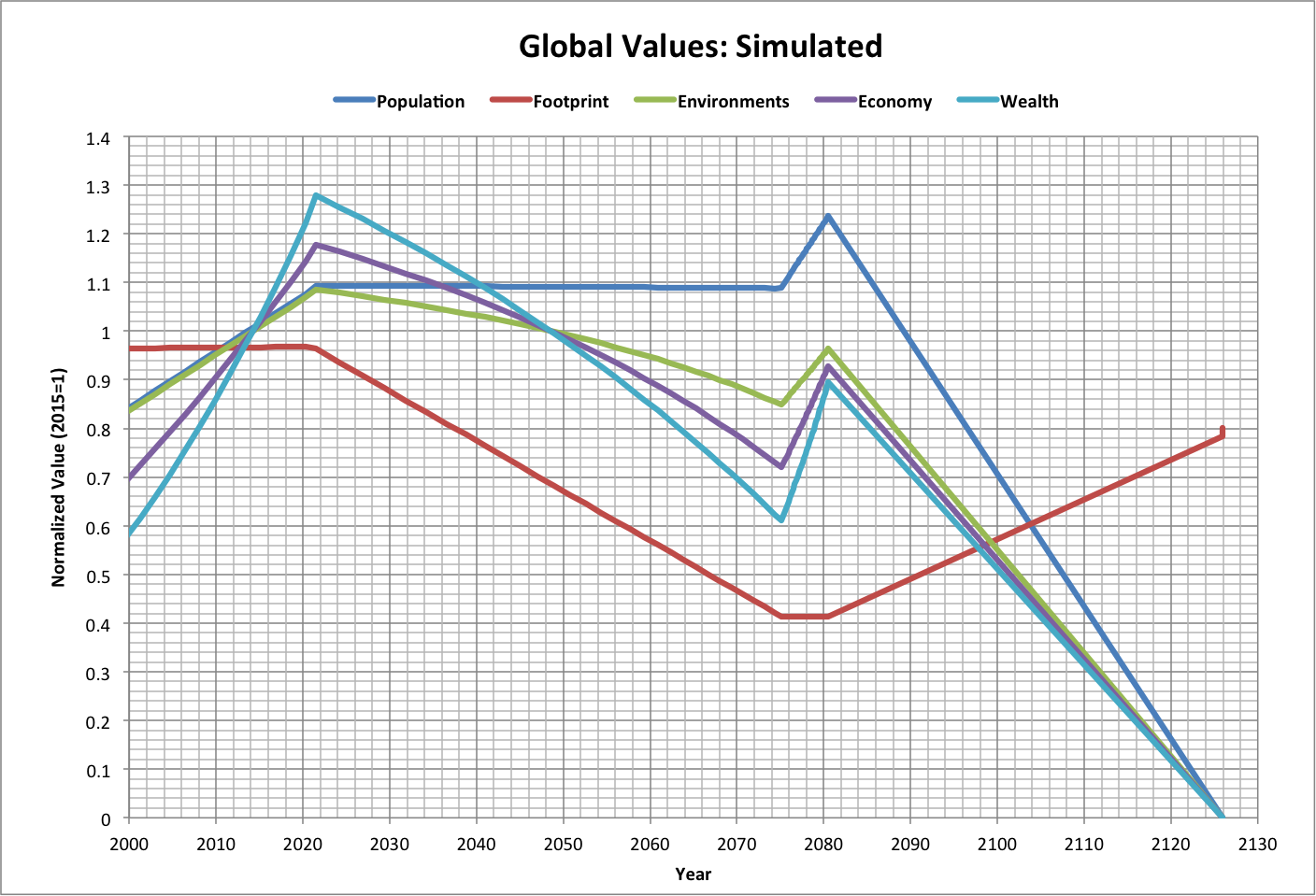 Here, F is the average per-capita ecological footprint in Earths/person/year and Fmin is the minimum ecological footprint. Points on the graph represent a value of global footprint (Fe = P * F, where P is population), separated in each simulation by a difference of 0.01 Earths/year. Simulations and the result all start at year 10000 B.C.E., when P = 1E+06 people and f0 = F0 / Fmin = 7.97E-01.