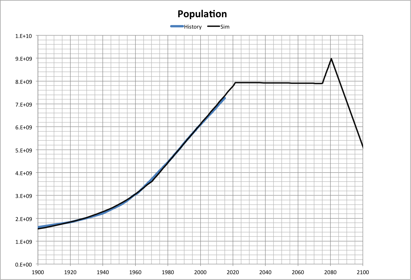 The resulting values of f , P, and Fe are shown below along with historical data and includes a futurecast with no global warming: |