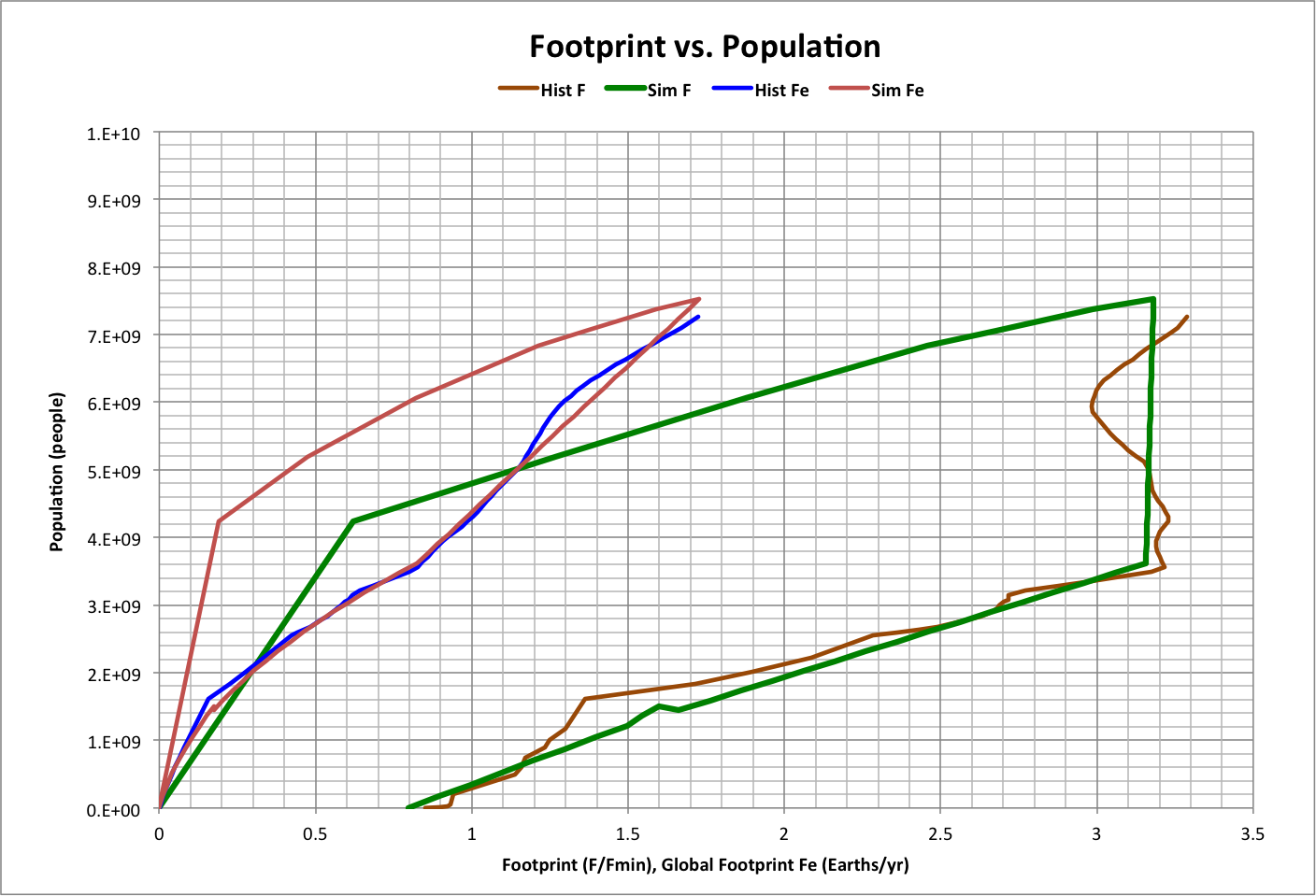 | Simulated per-capita footprint vs. population and global footprint vs. population are graphed below this scenario, with historical values plotted for reference. Roll over the image to see how these compare with combined worst climate projections. |