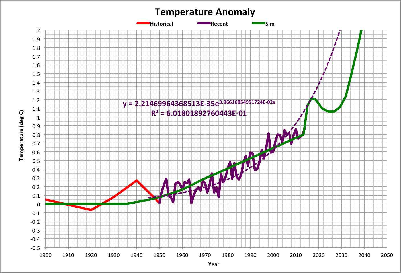 The model for Backcast Version 2 can be used to project future scenarios based on anticipated effects of global warming. The following graph shows average global temperature (difference from the Industrial Revolution), and a projection of temperature based on recent data that best matches current and expected temperature rise (as of March 2016). Sim uses the backcast model to show anticipated temperature after human response to the effects of 100% self-sustained global warming as described below. Note that in this and other graphs, years are marked at mid-year. |