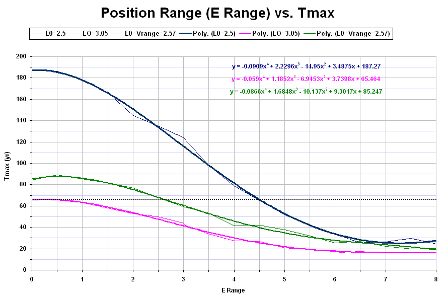 If a population's comfort zones ("V") and positions ("E") are measured on a scale from zero to ten, and varied over a range centered on a specific value ("V0" for comfort, "E0" for position), average per-capita consumption will vary -- and with it, life expectancy, happiness, and resource depletion time ("Tmax").