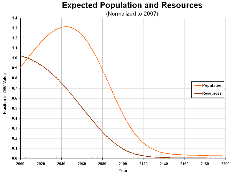 BELOW: World population and resources, as fractions of their calculated values at the end of 2007. This graph combines projections from consumption of ecological resources (measured by the Global Ecological Footprint), energy (production), and economic resources (measured by the Gross World Product).