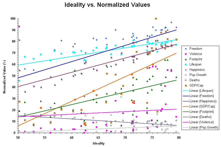 Ideality "Ideality" is a measure of how well people are living. It is the average of life expectancy and happiness for a population. Below is a graph of several variables as a function of ideality for a sample of 43 countries: