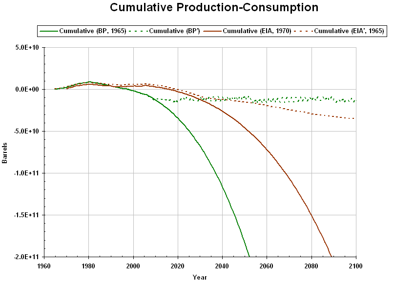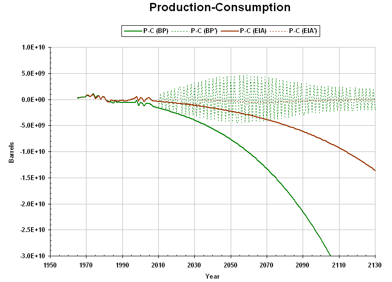 World Oil Applying the consumption model to world oil production and consumption (data through 2007), consumption will surge above production even though there are enough known reserves for production to keep up. Further, the model suggests that the total amount of oil may be at least 100 times the amount of known reserves. Data from BP's Statistical Review of World Energy 2008 shows consumption above production since 1980, implying that the world has been drawing on previously produced oil for the difference. Data from the U.S. Energy Information Administration (EIA) is more equivocal. If projections of BP data are correct, then consumption will be constrained to lower-than-desired production by the end of this decade; if projections of EIA data is correct, then this will occur within three decades. In the following graphs, projections are given for BP and EIA data, which do not constrain consumption to production. Population from the footprint projection is used for those labeled with a prime (BP', EIA'), which includes production-constrained consumption. "Total Reserves" for a given year is the known reserves plus the production for the year.