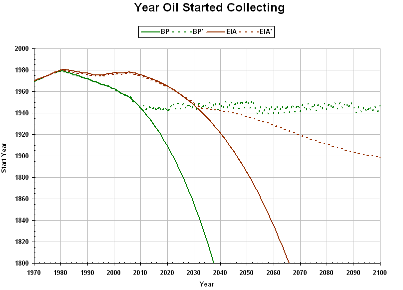 The number of people who can use the oil is shown below. Projected population using the footprint is shown for comparison (FP). If all excess oil (production less consumption) was available to make up the shortfall in a given year, then collection of it would have had to begin in the "start year" shown below: If all known reserves in the start year were available for collection, then the maximum amount of oil available for use in any given year is shown below: The price of oil is somewhat correlated to consumable oil (above). Following is the projected price of oil: