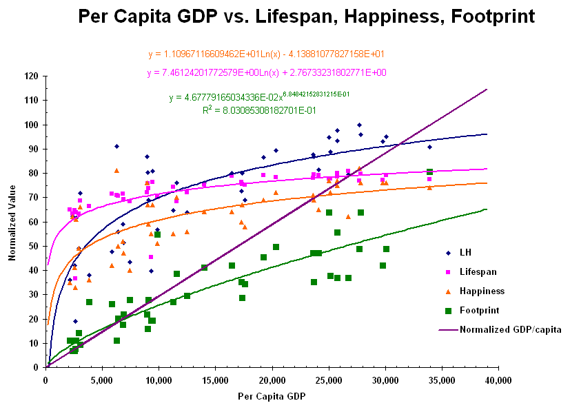 GDP per Capita There appears to be a correlation between per capita Gross Domestic Product and lifespan and happiness (based on a sample of 43 countries): : Note that both lifespan and happiness peak after a certain GPC, and GPC has more of an effect on happiness than lifespan (a linear curve fit shows the slope 59% greater for happiness than for lifespan). Also shown ("LH") is the product of lifespan and happiness, normalized to the maximum.