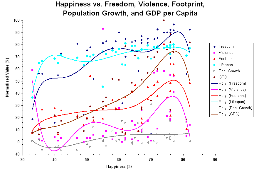 Values are normalized to percent of maximum, and collected from data valid in the 2002-2004 time frame. "Happiness" is a measure of quality of life, as defined by the World Database of Happiness (1). "Freedom" is a composite of three indicators of freedom tracked by the World Resources Institute (2): level of civil liberties, polity (level of democracy), and press freedom. "Violence" is assaults per capita (3). "Footprint" is per capita global ecological footprint (4). Lifespan is life expectancy, and population growth is the difference between births and deaths per 1,000 people (5). "GPC" is Gross Domestic Product per capita (6). Variables above can also be plotted as a function of footprint: