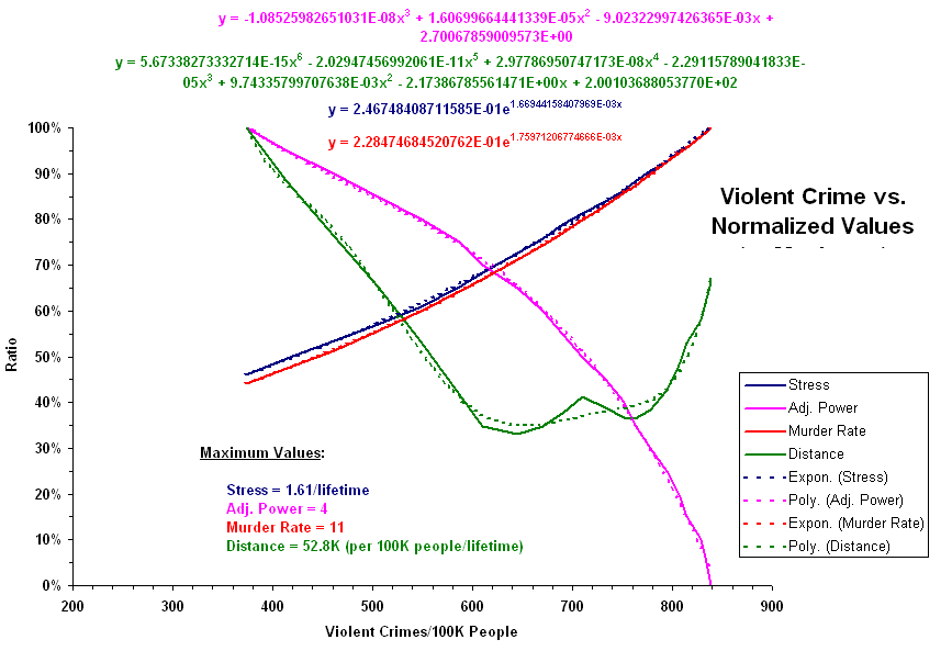 Stress and Crime - Version 1 Assuming that violent crime is perpetrated by the part of a population whose stress is greater than one standard deviation away from the average, the following graph shows the relationship between the violent crime rate (with an average lifespan of 77 years) and lifetime average stress, adjusted power, murder crime rate, and total distance traveled: With these relationships, we can see how average stress, adjusted power, and distance have varied over history: