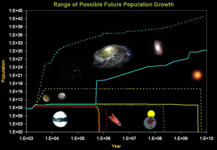 For humanity to survive the longest, we will need to settle space. The following scenarios are possible, where solid lines denote the least population growth, and dotted lines denote the highest: