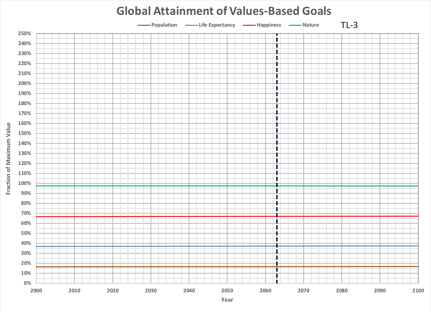 The following graph shows projected attainment of goals. The year that the best-case timeline (TL-5) attains total happiness for its population is indicated for reference. Note that the 100% values are the maximum attainable for TL-2. Roll over the image to see a longer timespan. |