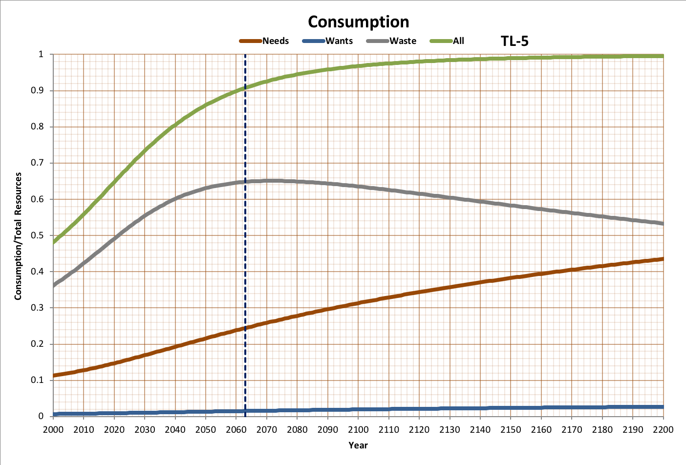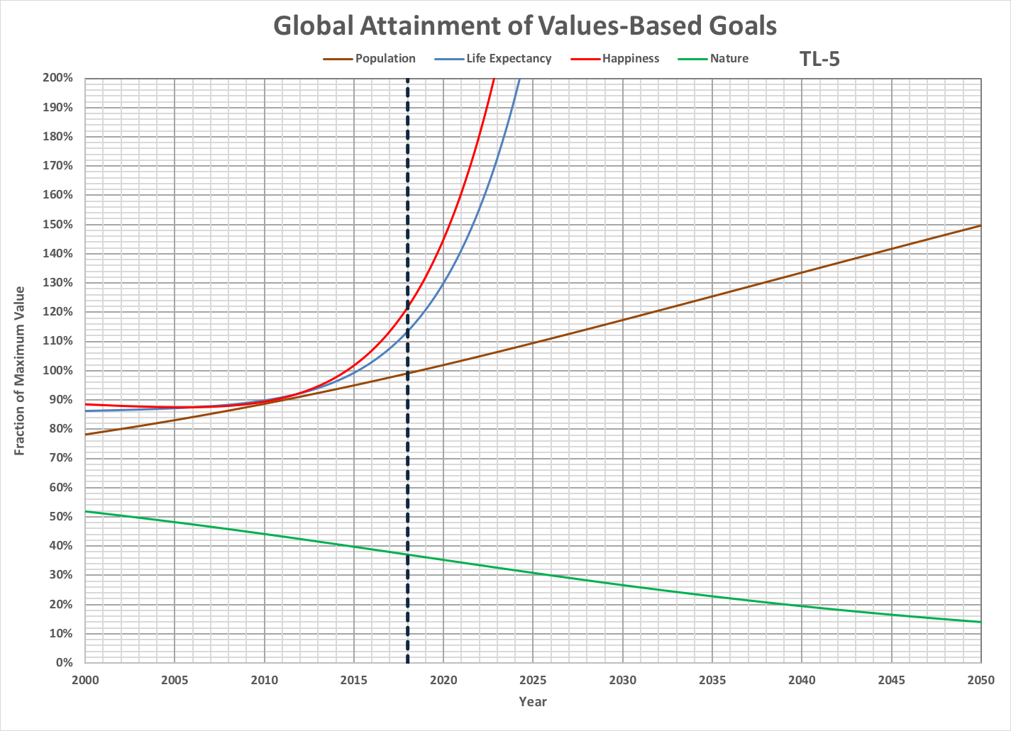 In the following graphs, two years are highlighted: 2018 (the current year and beginning of the Fix timeline), and 2063 (the year that the entire population is 100% happy. Note that the 100% values are the maximum attainable for TL-2. |