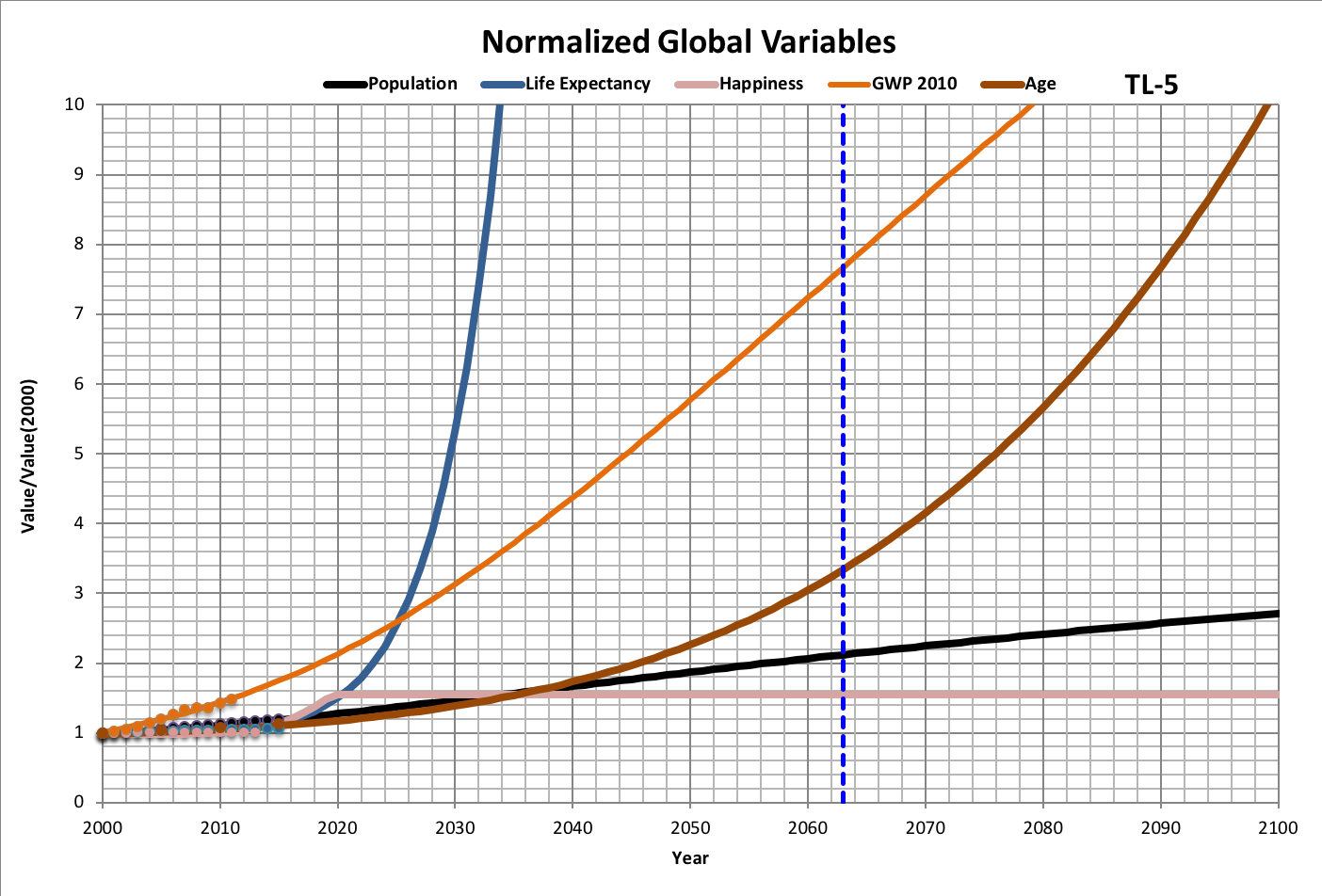 Timeline 5 (TL-5) is a best-case scenario for humanity's future. Beginning as late as 1995, population grows logarathmically with the species ratio Sratio.