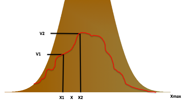 Each person in a population experiences values of global variables in common with others who consume the same amount of basic resources. The amount those variables change over the population is likely most meaningful between groups consuming a little less, and those consuming a little more of those basic resources than any person in the population. The changes for any particular variable form a "gradient" over the population. The following diagram shows a variable V changing as a function of Xfrac = X / Xmax, where X is roughly proportional to the basic consumption per person. Xmax is divided into intervals X2-X1 wide, each corresponding to a value of X that is in common with every person in the population within that interval. V has values V1 and V2 for X1 and X2 respectively. Each point of the variable's gradient, associated with each value of X, is calculated as V2 / V1. The diagram is not to scale, since the model divides Xmax into 5,000 intervals. |
