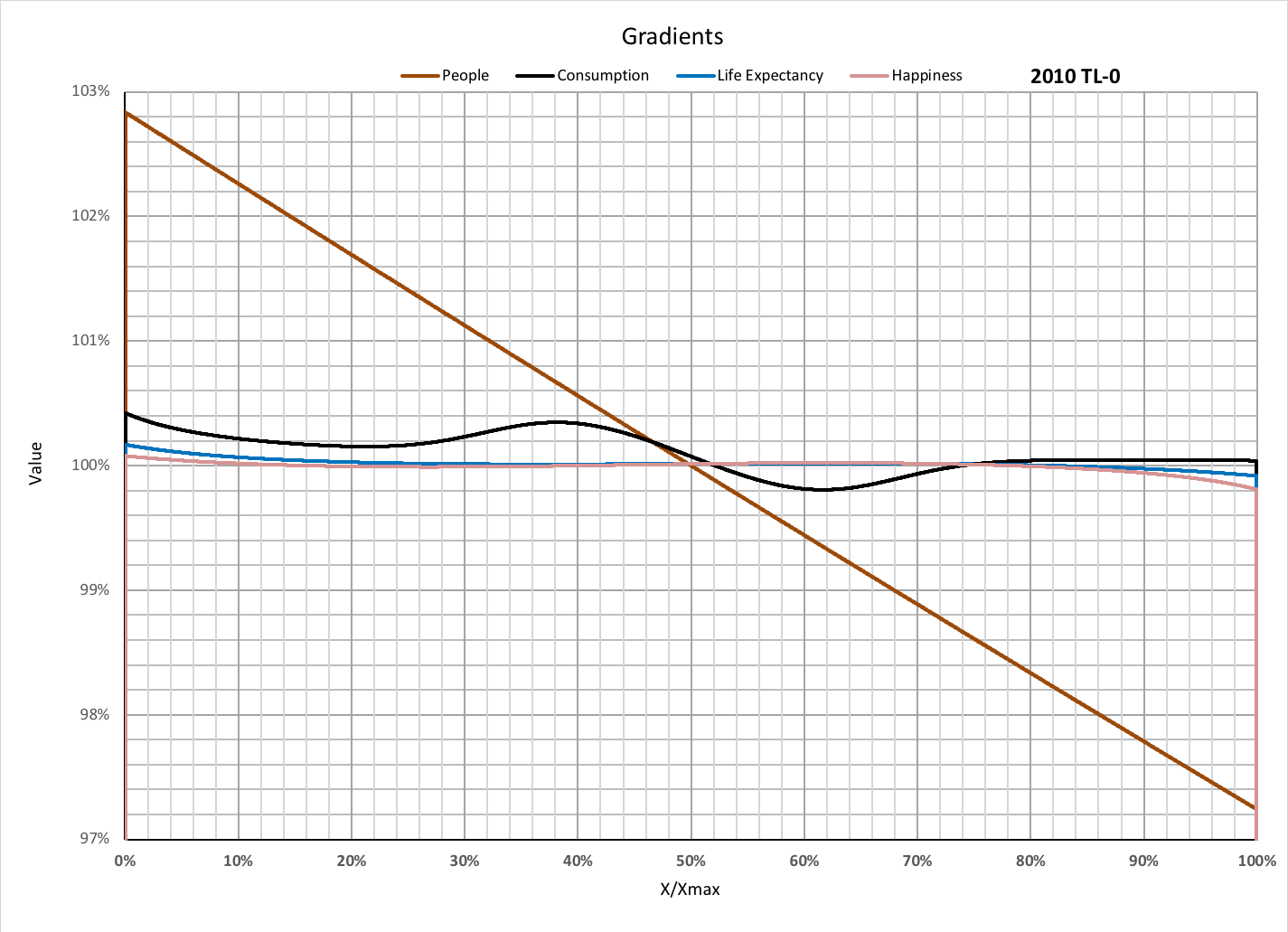 | Gradients for people, consumption (ecological footprint per group), life expectancy, and happiness are graphed below for each decade from 1900 to 2030, using historical data where available (TL-0) and simulated values (TL-2) when none is available. |