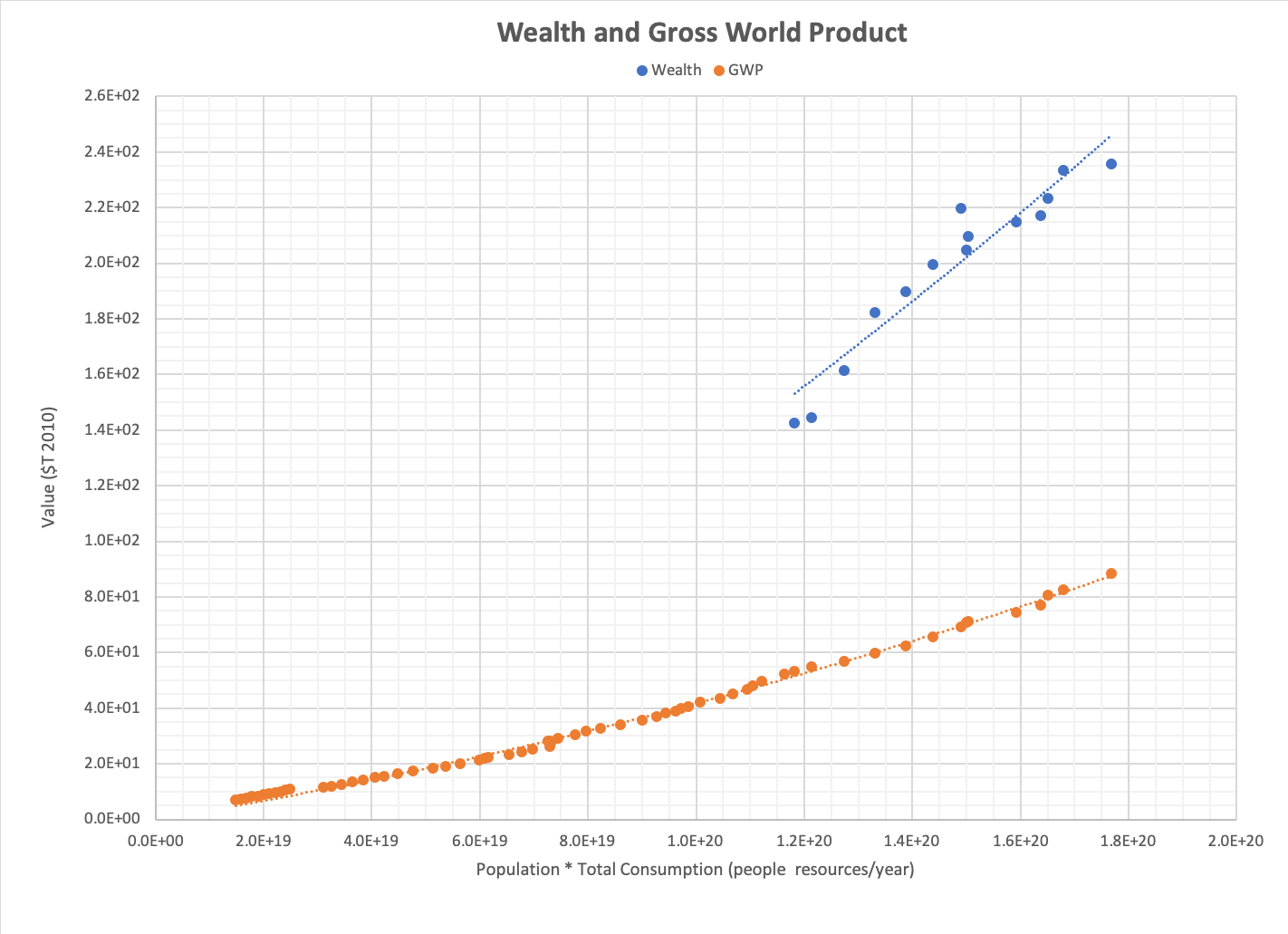 | Wealth and Gross World Product vary with the product of population and total consumption as follows. Roll over the image to see a graph of inflation. | ||||||||||||||||||||||||||||||||||||||||||||||||||||||||||||||||