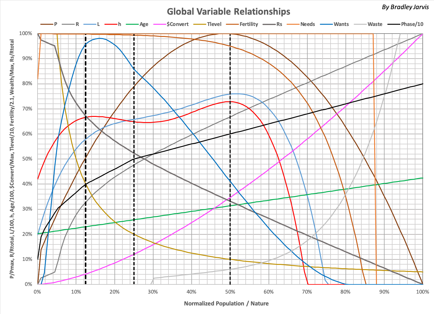 The following graph shows the relationships between global variables tracked in the Timelines model. Roll over to see the definitions as a function of phase. |