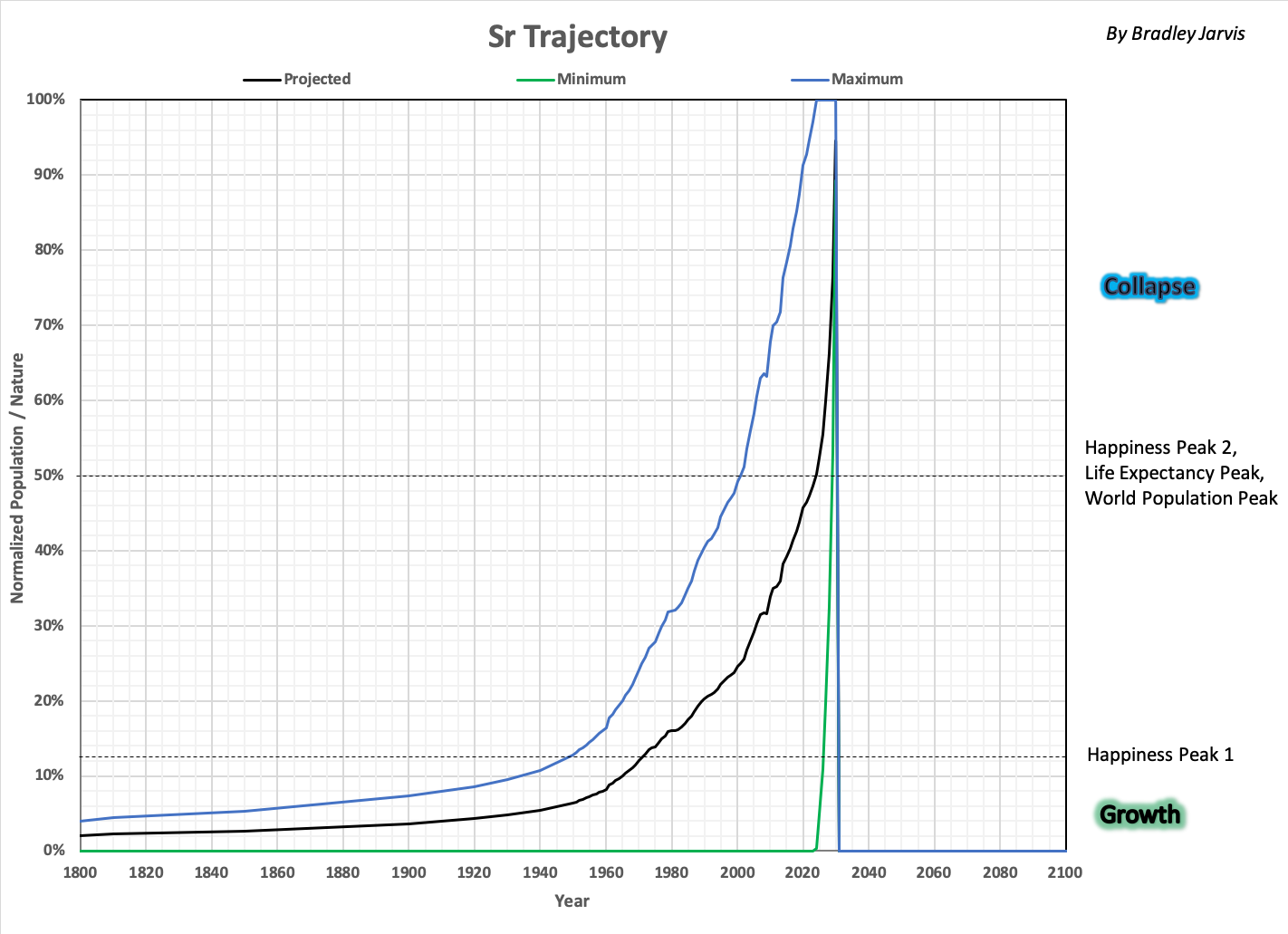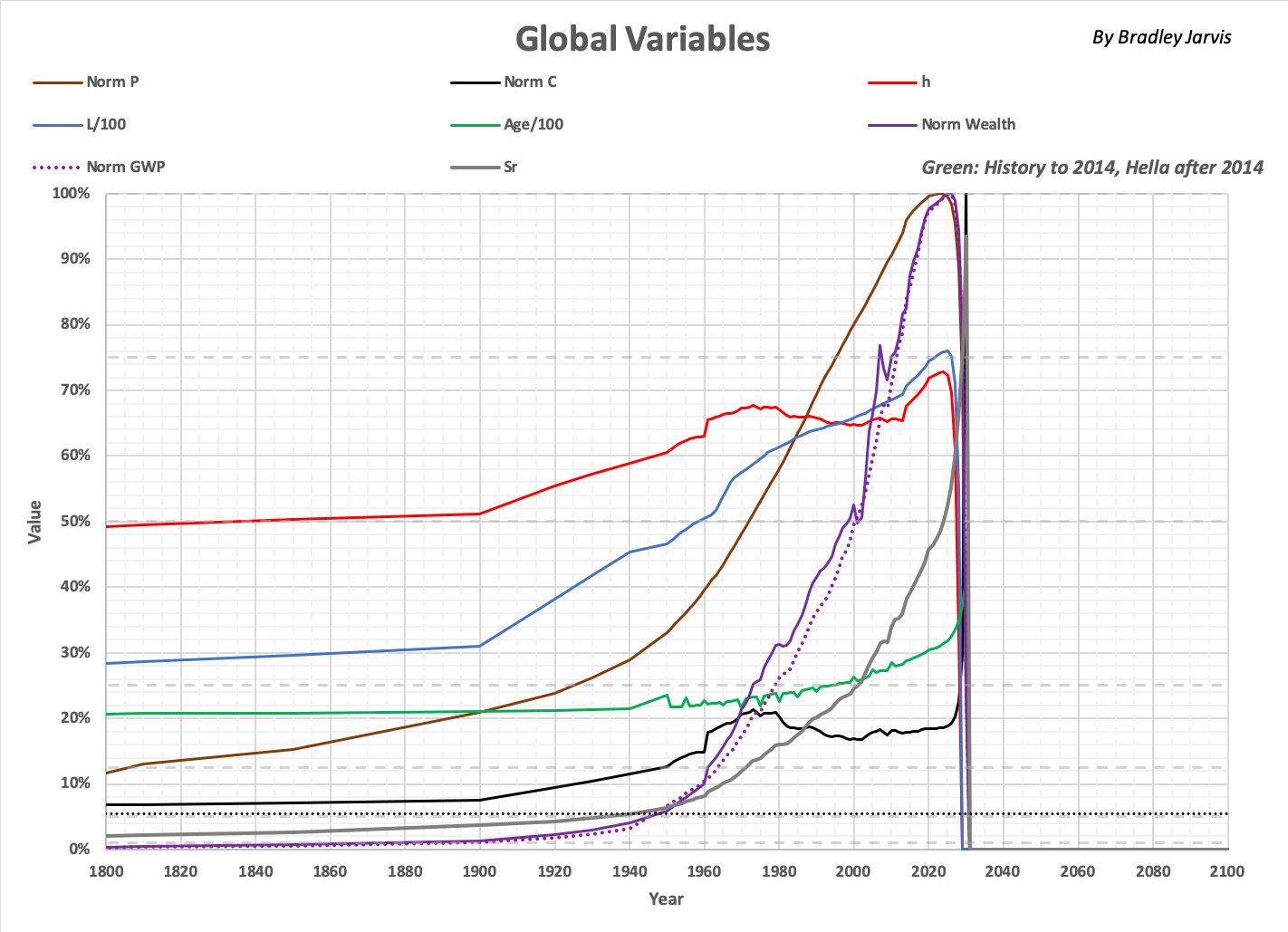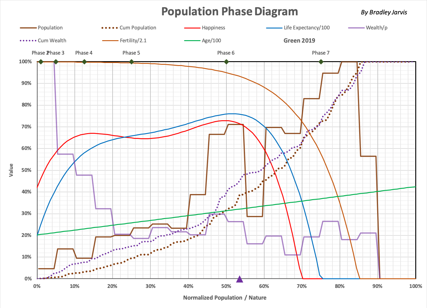 Black dotted lines indicate where "stages" of development are crossed in what can historically be considered as humanity's lifecycle. The distributions of global variables are simulated using 300 regions defined by randomly selected values in projected ranges of Sr and region Rtotal. One such simulation, "Green," is shown below the year 2019. Roll over the image to see how the variable change by phase. |