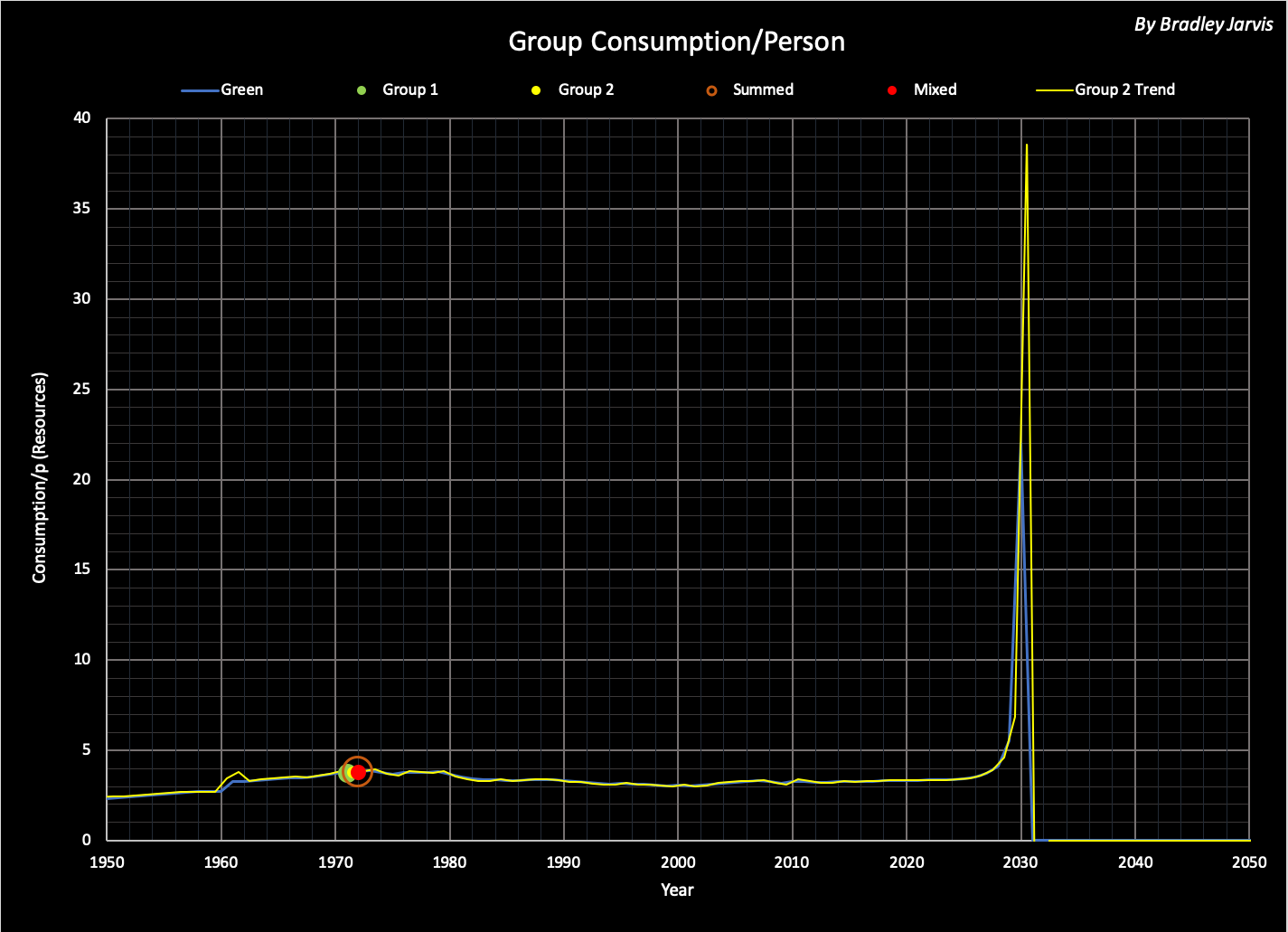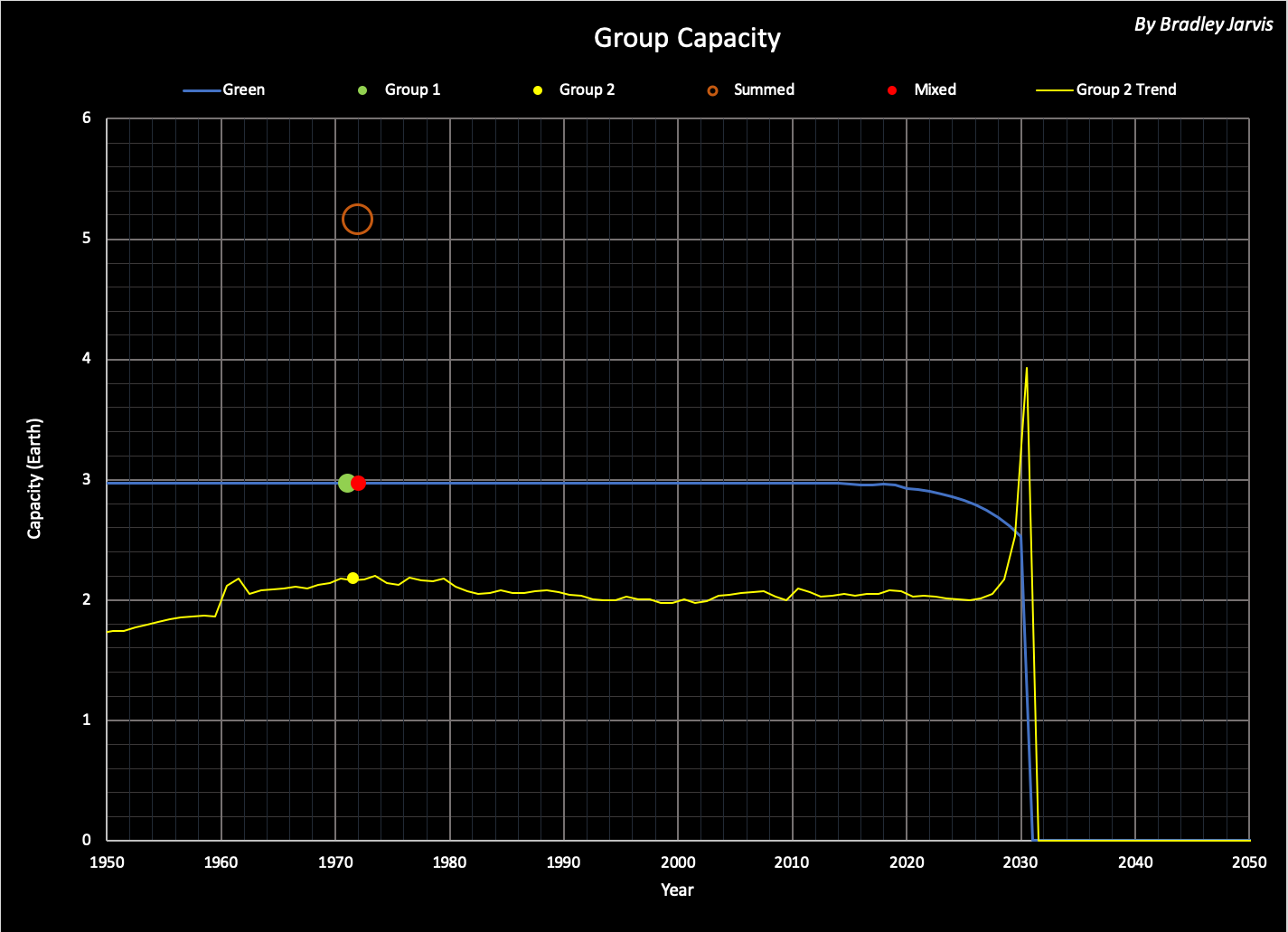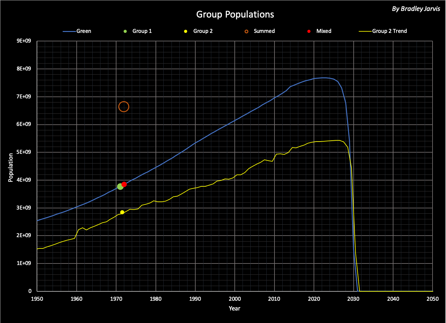 In the Timelines model, the state of a group can be derived from combinations of three basic variables: Population, Consumption, and Capacity. Values of other global variables can be derived from combinations of these. Changes in state of the world group over an interval of time is easily modeled as the interaction of the group (Group 1) at the beginning with another group (Group 2) to form a mixed group that becomes Group 1 for the next interval of time. The weights for Group 1 are all equal to 1, and the weights for Group 2 are all equal to per-capita consumption C for Group 2. Values for Population are shown in the following graph for groups in the Green simulation. The circles illustrate the groups for the interaction from 1971 to 1972 (Group 1 is plotted for year 1971, Group 2 is plotted for 1971.5, and both Summed and Mixed group populations are plotted for 1972). The blue line shows the annual values of Group 1 populations, and the yellow line shows the values of Group 2 populations between each pair of years. Roll over the image for more years. |