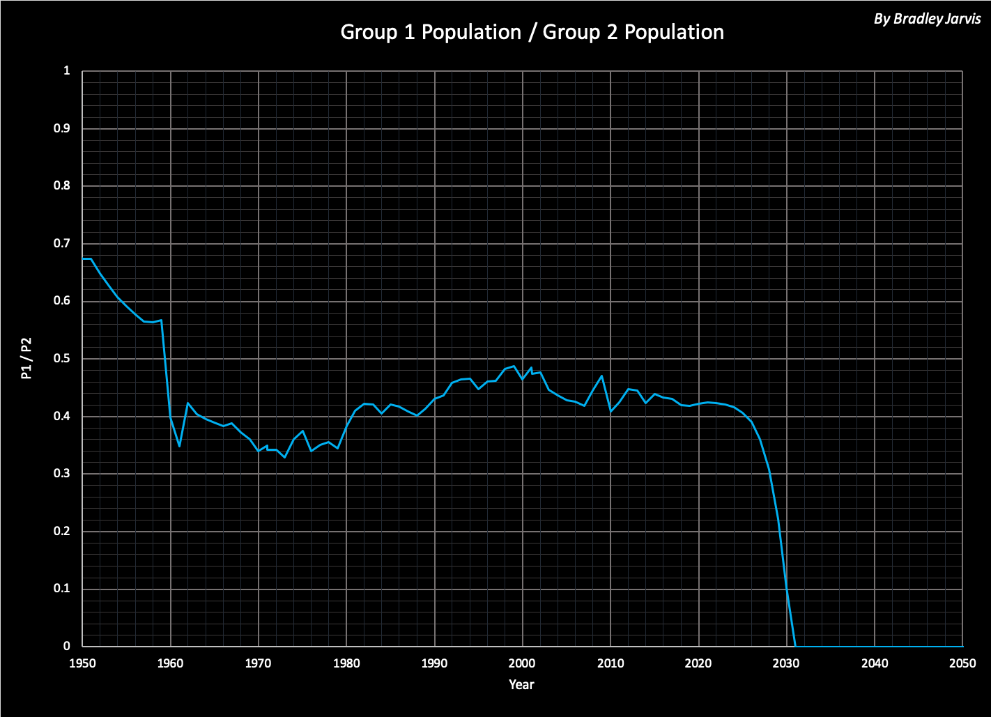 The relative contributions of Groups 1 and 2 to the mix of the two are expressed as the ratio P1/P2 in the following table. Changes over history have some correspondence to phase - and potentially a few notable events.