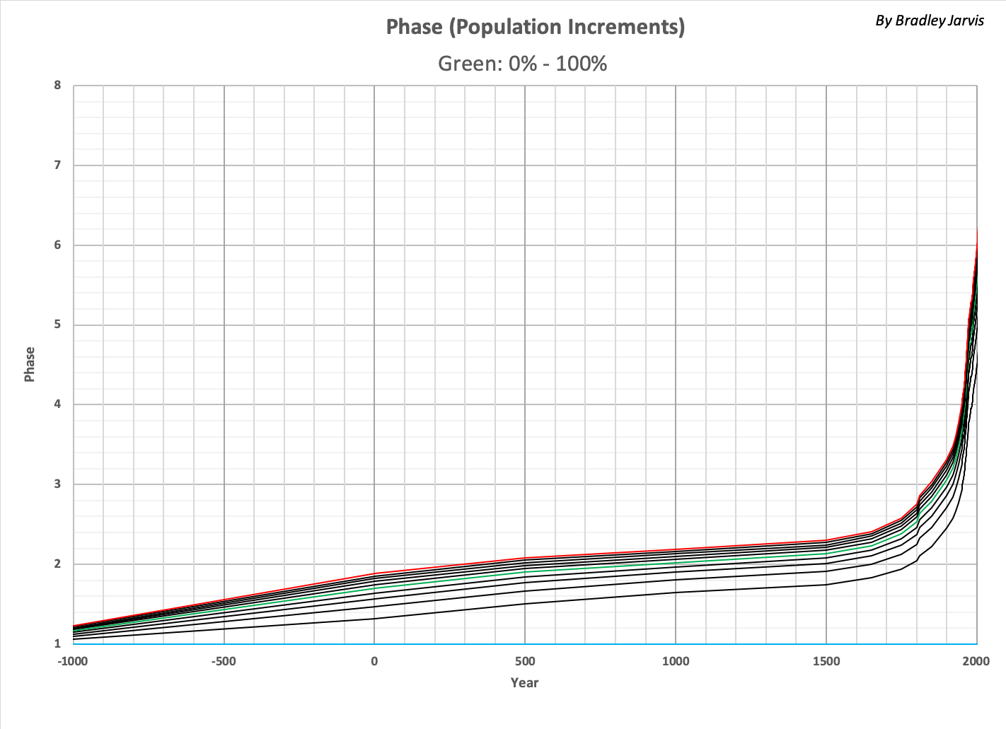 NOTE: Terms in italics are defined in Timelines Version 5. The following graphs project how the world poplulation is distributed across phases over time for simulation Green. Each pair of lines surrounds 10% of the population. Minimum phase is in blue, maximum phase is in red, and the phase of mid-population (50%) is in green. |
