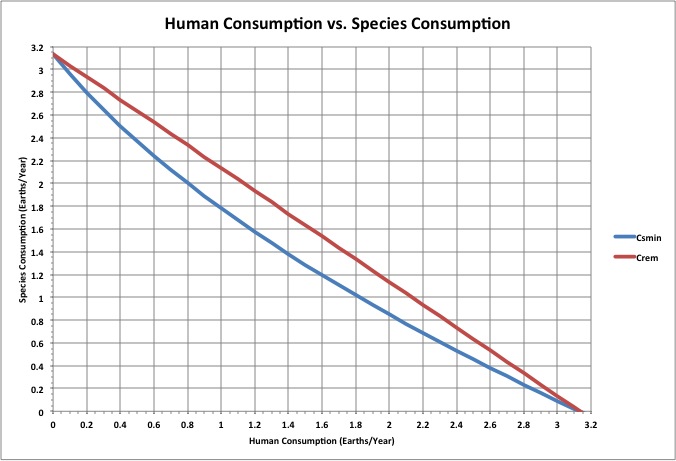 Species consume a minimum amount of resources to take care of themselves and perform the functions required to keep the planet habitable. The total amount consumed for these purposes is Csmin. As the amount of available resources (Crem) decreases due to human consumption, the populations decrease, resulting in a proportional decrease in Csmin. The difference between Crem and Csmin is consumed by species as an additional cost required to obtain the minimum amount. When Csmin reaches 1 Earth (the amount produced per year), the remaining members of other species cannot support the basic habitability functions and survive. Human consumption is 1.82 Earths at this point. As Csmin drops further, it's all they can do to support themselves, even as decreasing availability of resources continues to diminish their numbers.