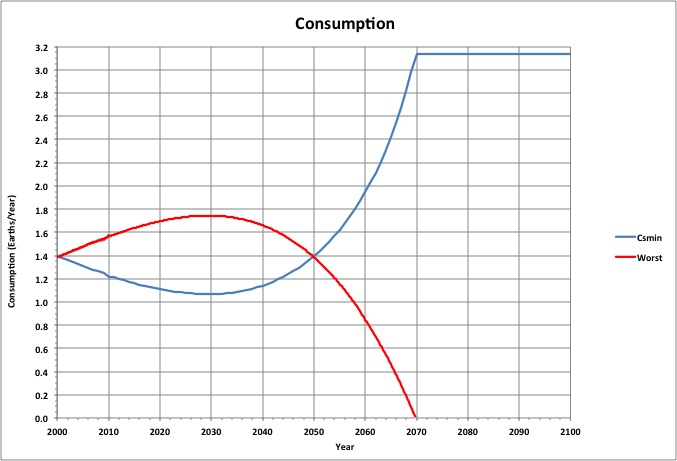 As Csmin approaches 1, human consumption begins to peak (represented by the Worst curve fit to historical data). Only if human consumption falls will Csmin recover. Note that as of the end of 2010, we were consuming an estimated 1.58 Earths.