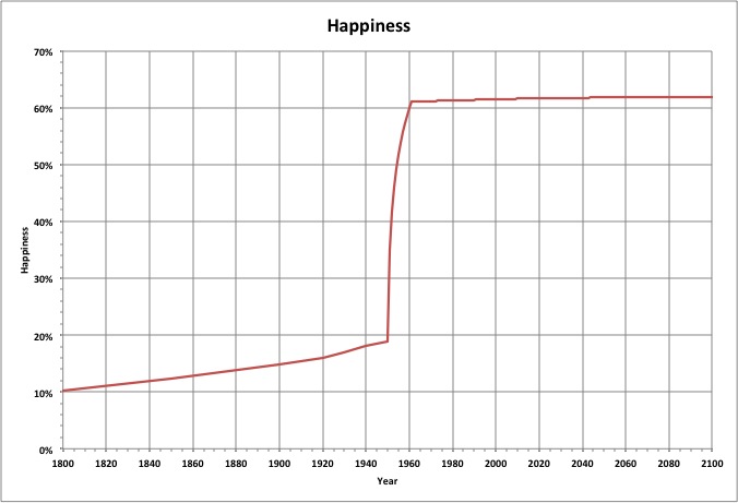 Happiness is projected to be as shown, rising to nearly 20% until after World War Two, then rapidly increasing to over 60% and increasing relatively slowly afterward. |