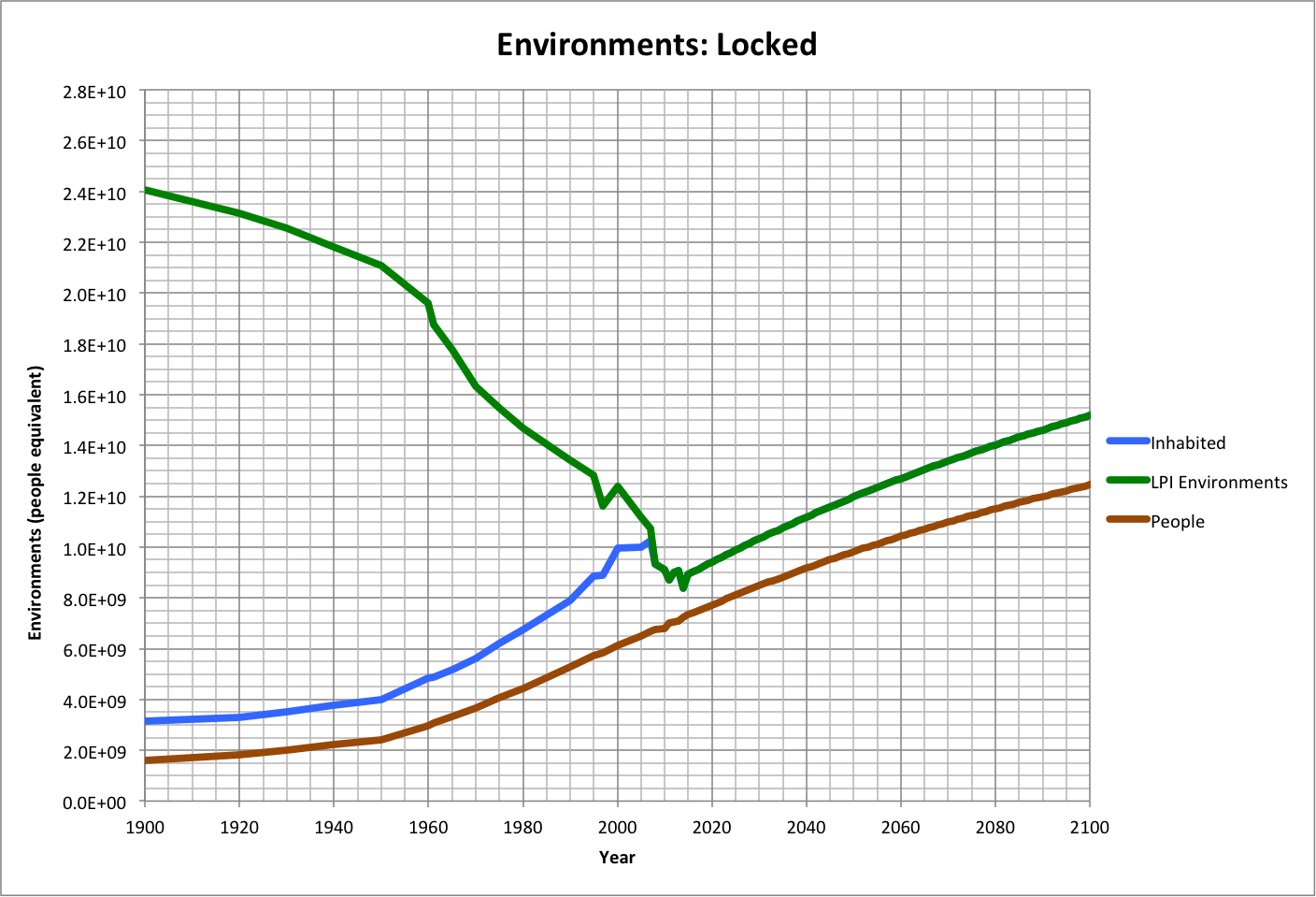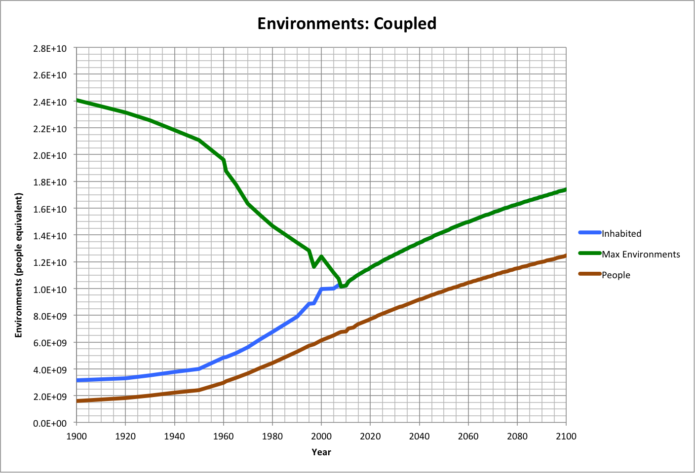 As in the Worst case, total ecological footprint is expected to reduce the maximum environments, as suggested by scaling them to the Living Planet Index (a measure of the populations of other species). Figure A illustrates the direct effect on LPI, which breaches the inhabited environments in 2008 and the human population directly in 2019. It reaches zero in 2052. Figure B shows what would happen if the LPI grew along with inhabited environments (the two were "coupled"). If we had access to the resources needed to support growth, the rest of Nature would be effectively irrelevant. Figure C illustrates the Best case's version of the favored scenario described in the Worst case discussion. Here, inhabited environments are driven with the LPI low enough for the Ppop/Epop ratio to approach hmax, after which they remain at that ratio while rising with life expectancy. As with the Worst and expected cases, the environments are offset from the population, accounting for the difference between hmax and actual happiness. |