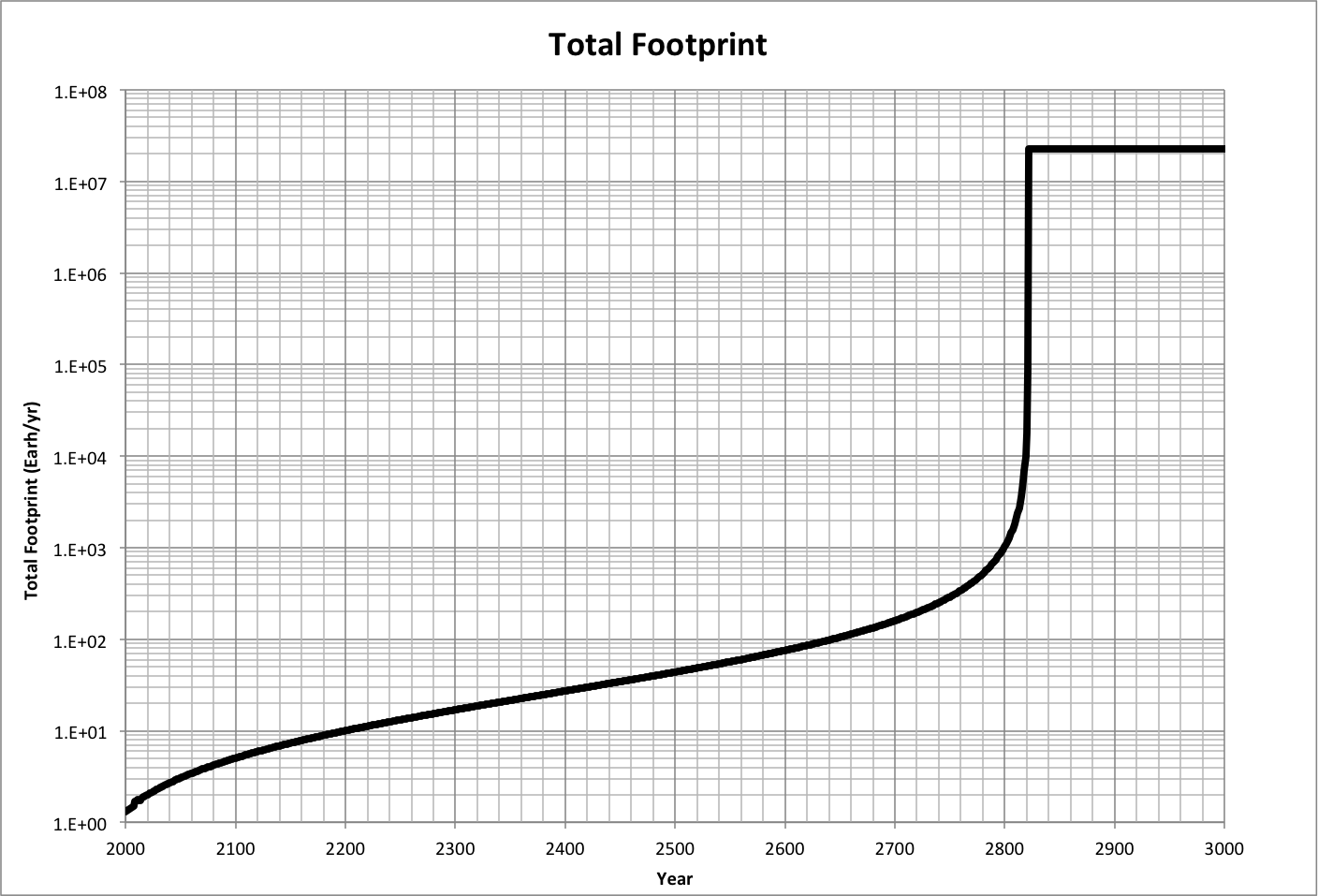| This leaves unresolved where the resources are acquired to sustain growth, but the source must be huge. This is clear from the magnitude of total footprint (graphed in Figure D) which must grow by several orders of magnitude. Note that in Figure D, it is assumed that life expectancy gets to an arbitrary 0.999999 of its maximum limit. | |||