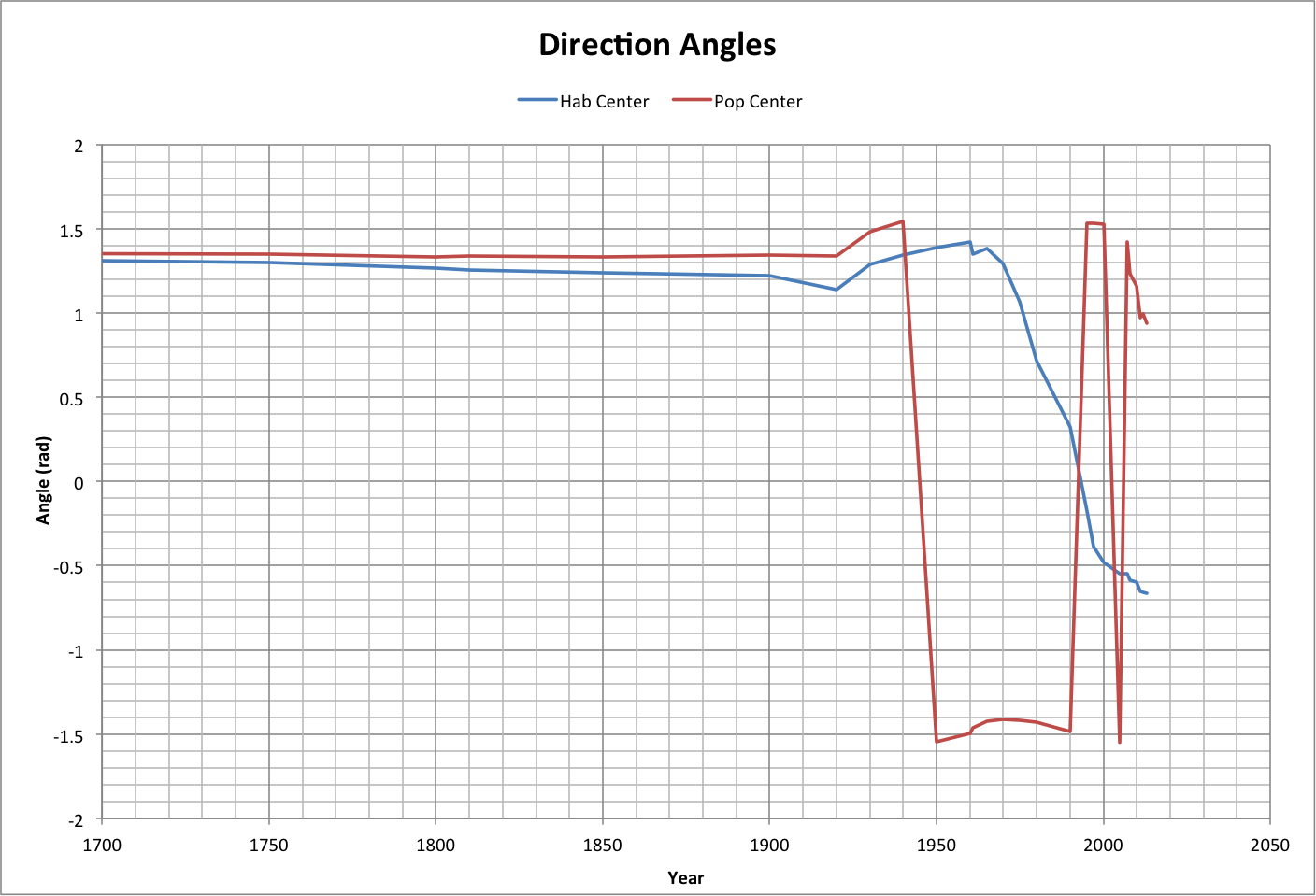 | The following graph shows how the direction angles have changed since 1700. |