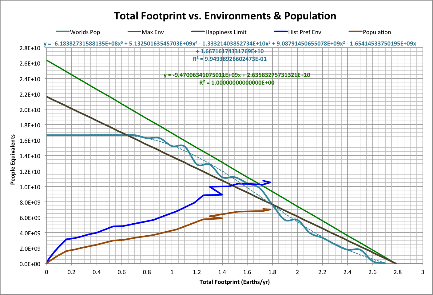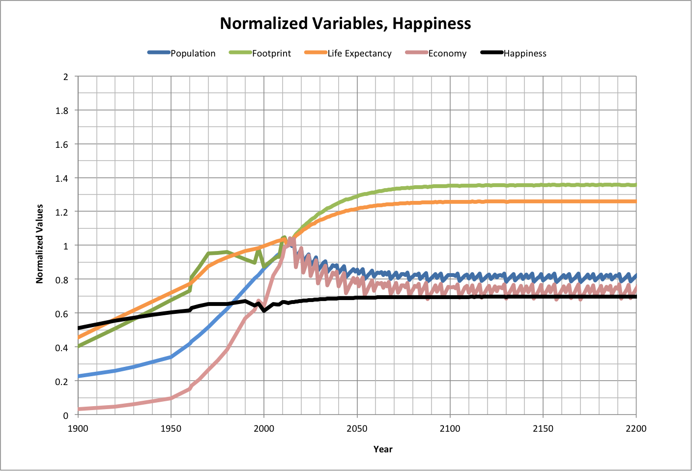 History and projections of variables from 2013 are shown below. The graph shows values of population, footprint, life expectancy, and economy (square of happy environments) that are normalized to what they were in 2013. Actual values of happiness are also shown. Roll over the image to see a close-up of LOG(F/h) vs. LOG(Ppop/h). |