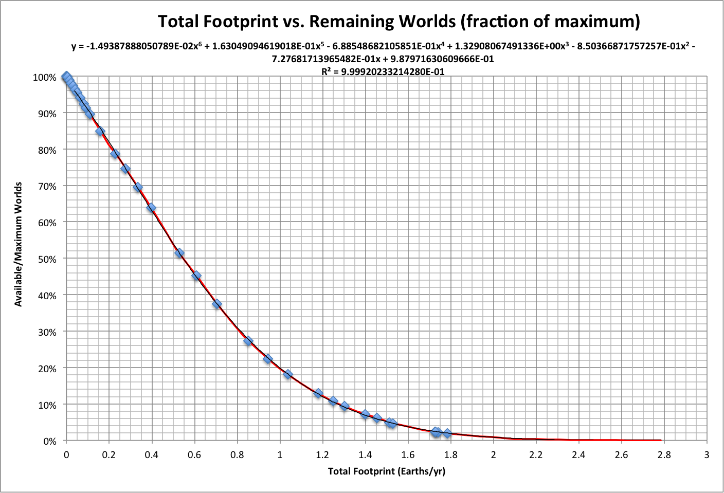 Note that the putative population peak occurs close to where Worlds Pop intersects Happiness Limit. Roll over the image to see a projection of population beyond 2013: it approaches the limit, moves away, and approaches again, in an infinite set of oscillations ("popscillation"). This projection is based on a simulation starting in 2013, where the Pop Center is targeted and the speed follows the curve fit of speed to distance from the Hab Center. |