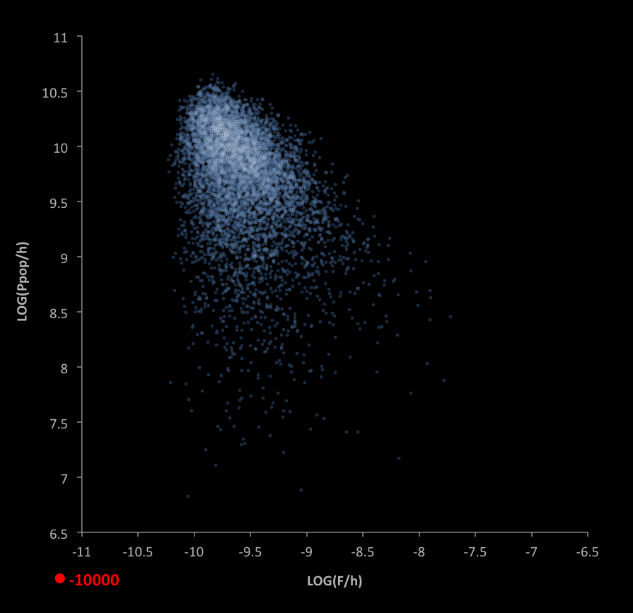 Further analysis of simulation data for the Population-consumption model demonstrates how humanity has historically sought out the most options for living with more people than we have. A simulation of 7,150 "habitable worlds" (options matching the criteria on p.1) show a cloud-like distribution when plotted as shown below. In the graph,